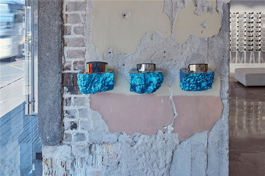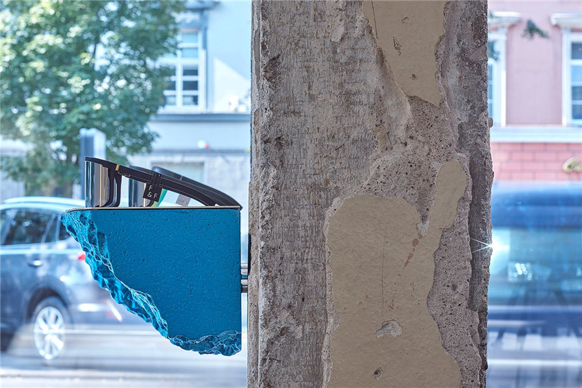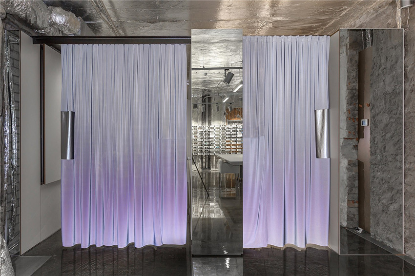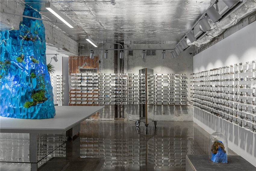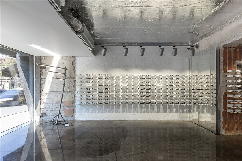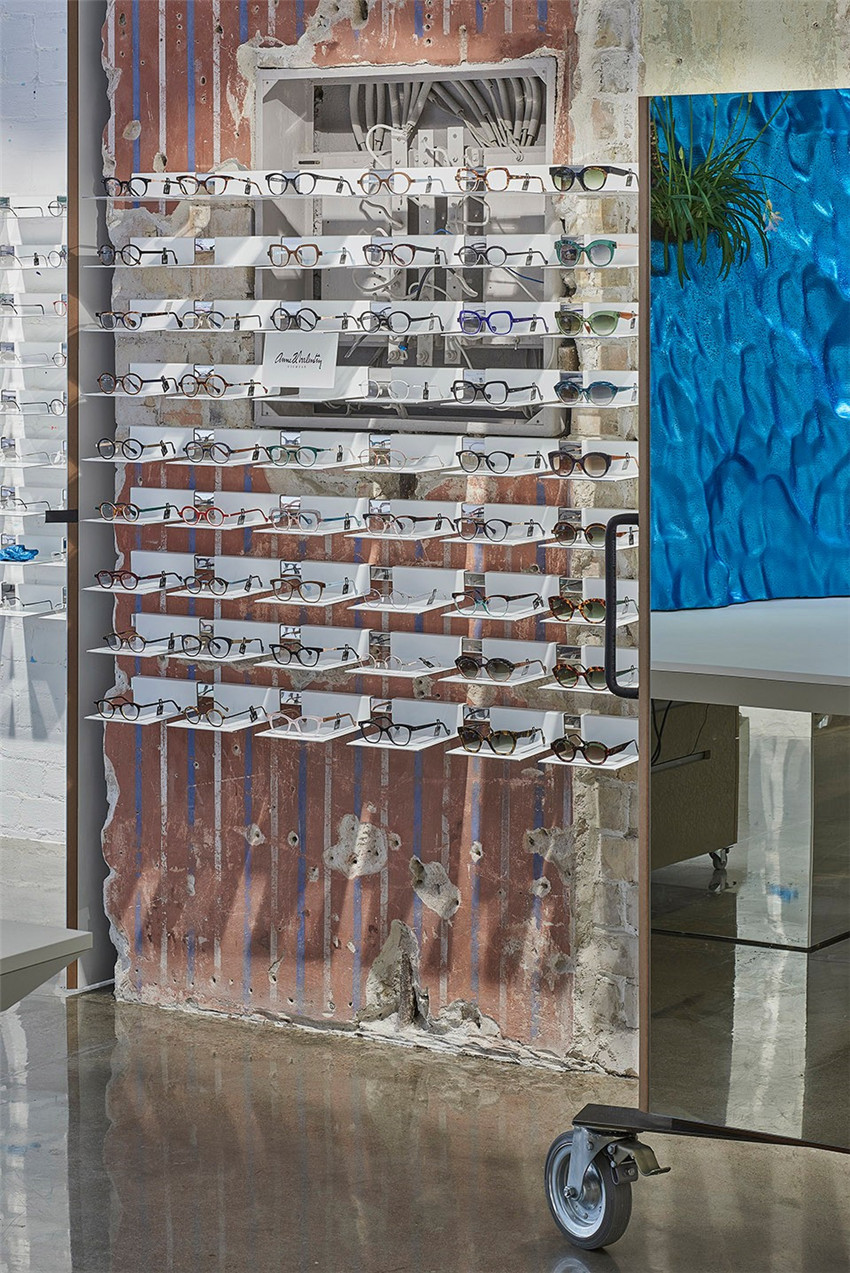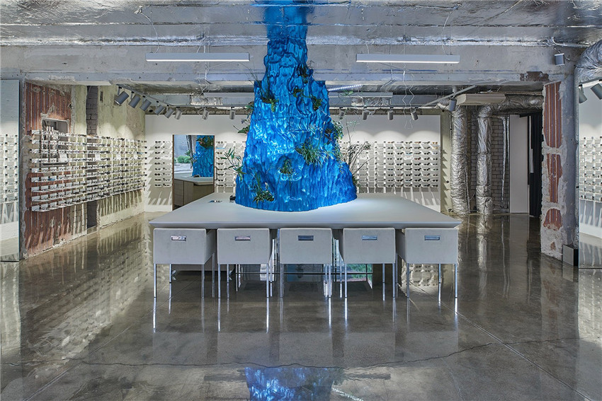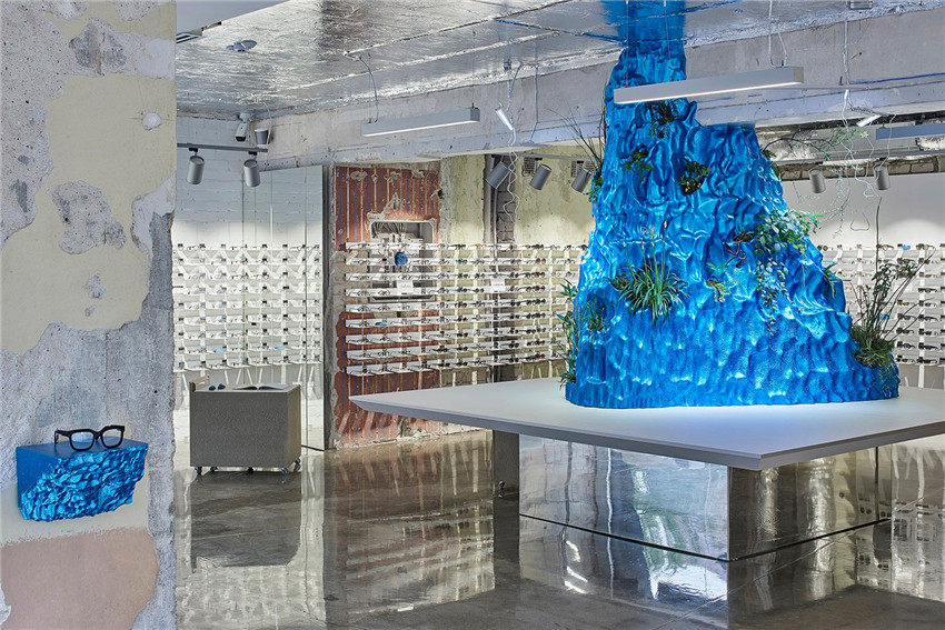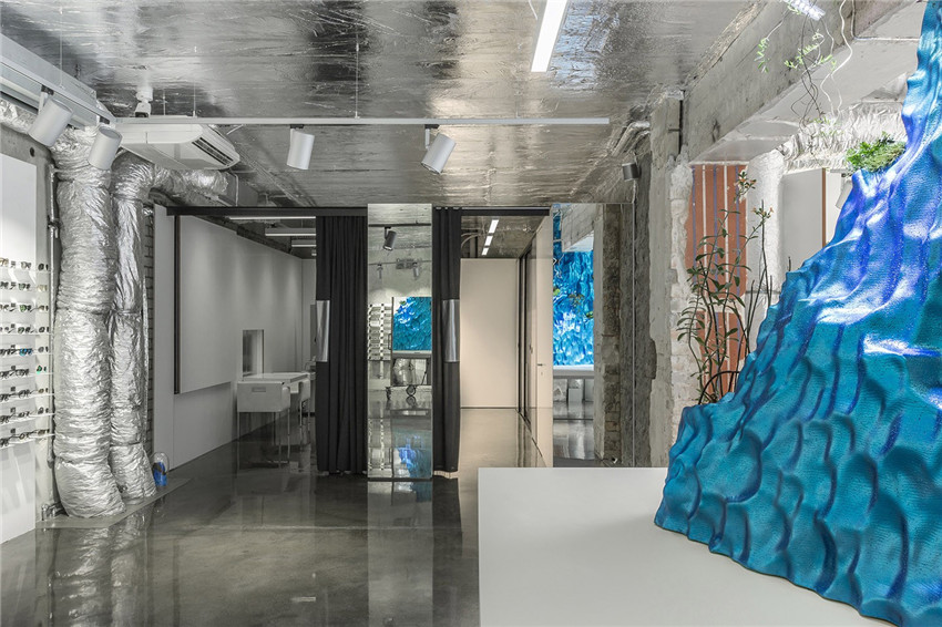 “回忆历史上的城市形象”是整个空间设计的逻辑主题。眼镜店中间的空间既是花园,也用作公共空间,是整个空间的点睛一笔——它象征着空间的内在属性,又与其本身的功能很好地相结合。公共空间的整体氛围,是通过眼镜店大面积的窗户与天空的反射效果实现的。花园和流水则是由一个新“装置”来诠释——一个具有独立生态系统的蓝色巨物。设计师保留了建筑原有的露出部分,因为这些部分上留有岁月的印记。