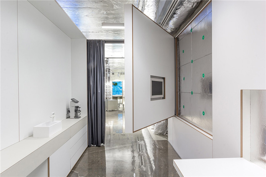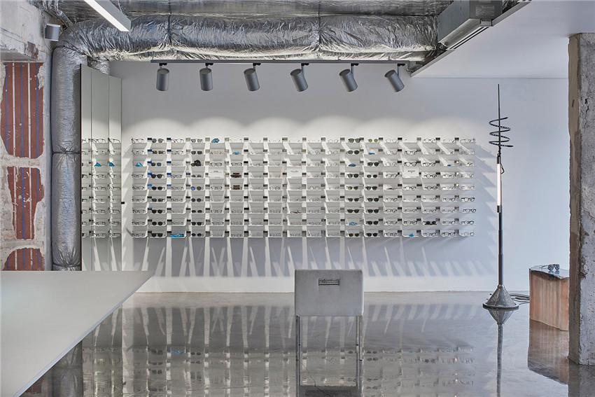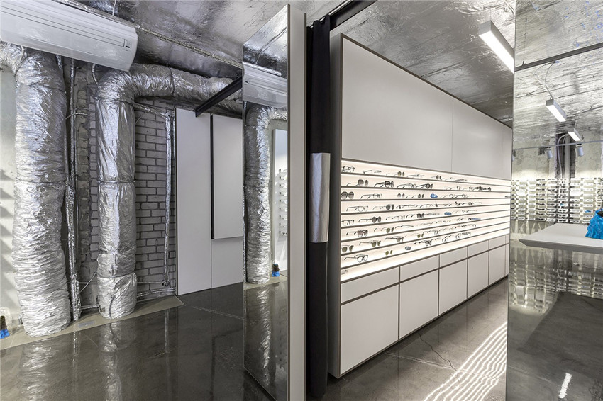 设计师将精准的光学和精密的验光的元素融入了空间设计。设计师巧妙地利用镜面来解决平面的不规则性。客人在中心处可以环视所有展出的镜架。店内尽头处左边的空间既是验光室,也是档案室。