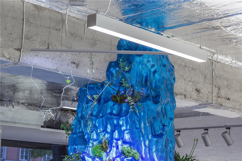 在店内中间的蓝色“岩石”和嵌入其中的生态系统都是手工和数字编程结合的产物。岩石的东、南、西三面斜坡,种有不同种类的绿植,有的只能存活于温和的气候条件下,有的则是在恶劣的气候下也能生存。