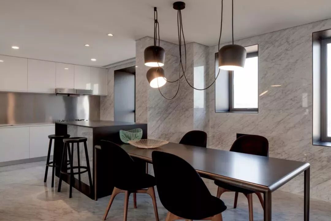 一组暗藏玻璃移门划分出厨房区域,对黑色的挑选极为纯粹,让艺术质感流淌,品位格调升级。沉调与亮调贯穿两个界面的自由探寻。