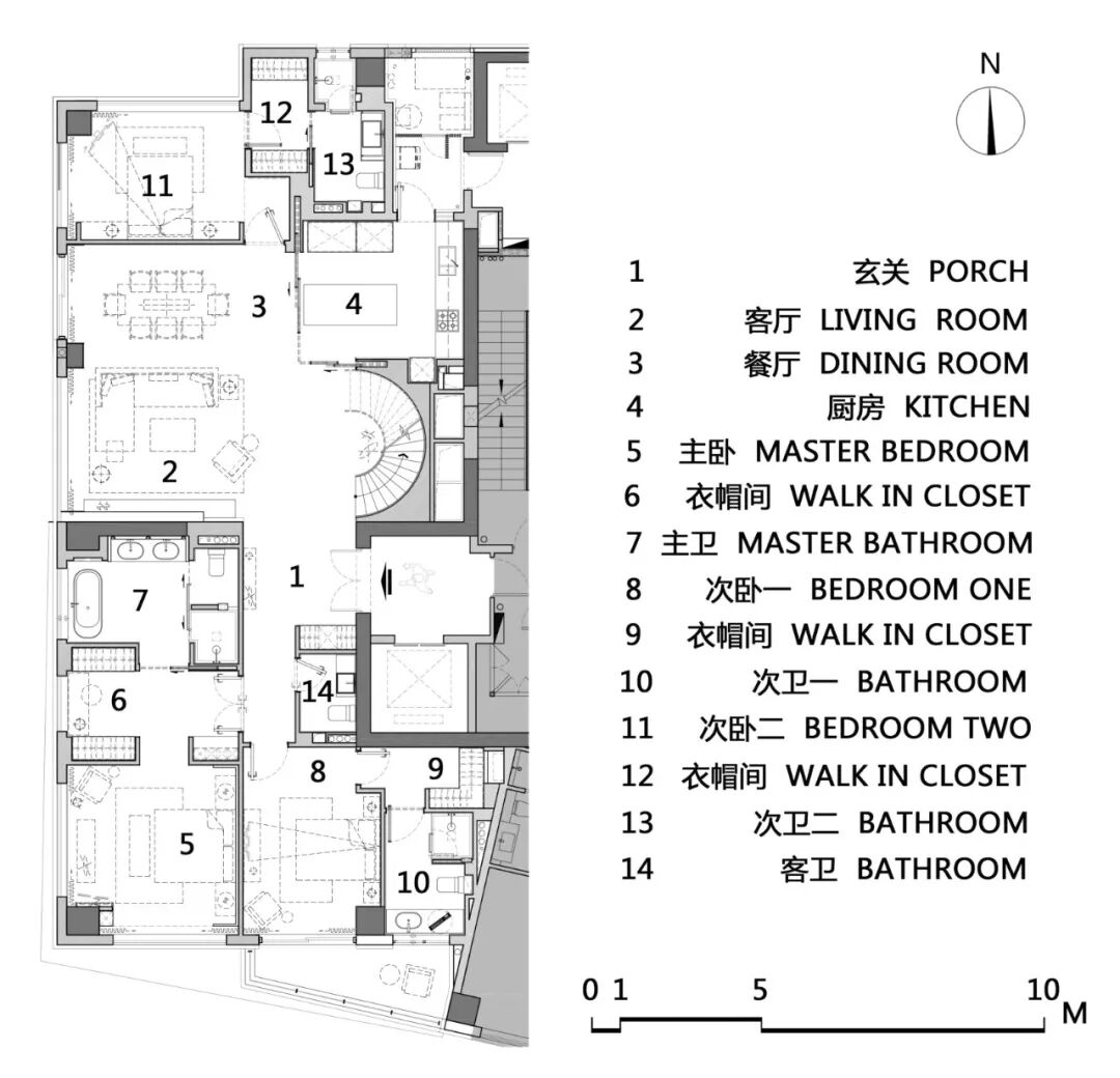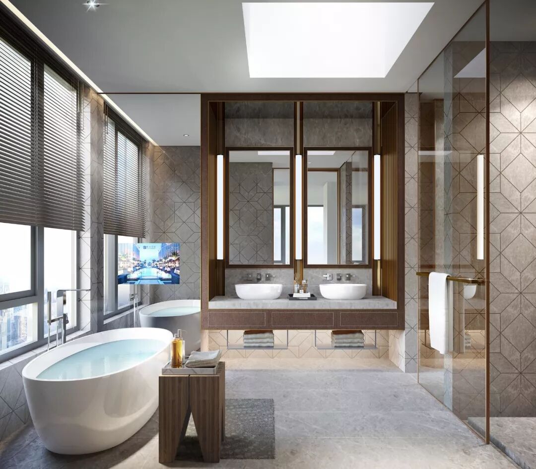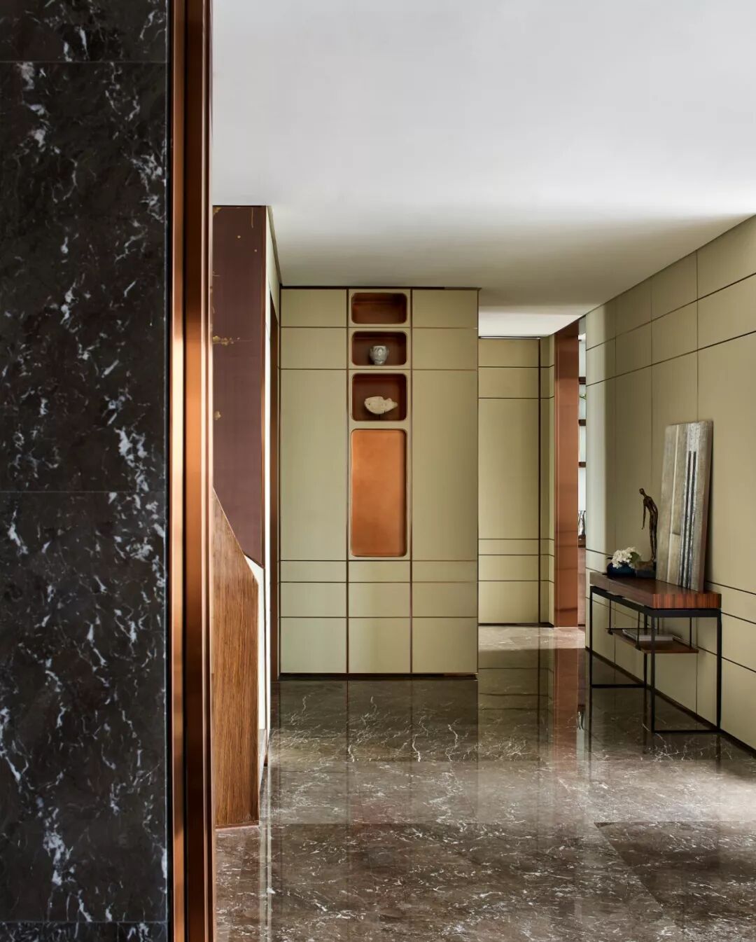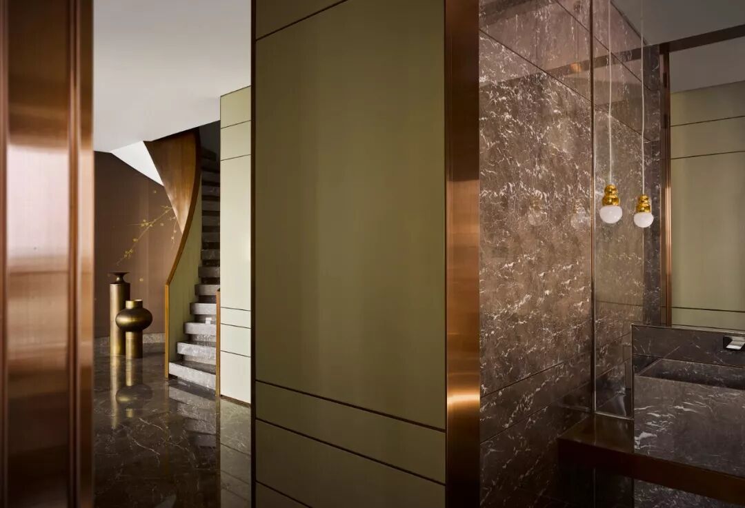 主要材料 | 拿铁灰石材、珍妮灰石材、古铜、黑胡桃木、珍珠鱼皮、壁布
