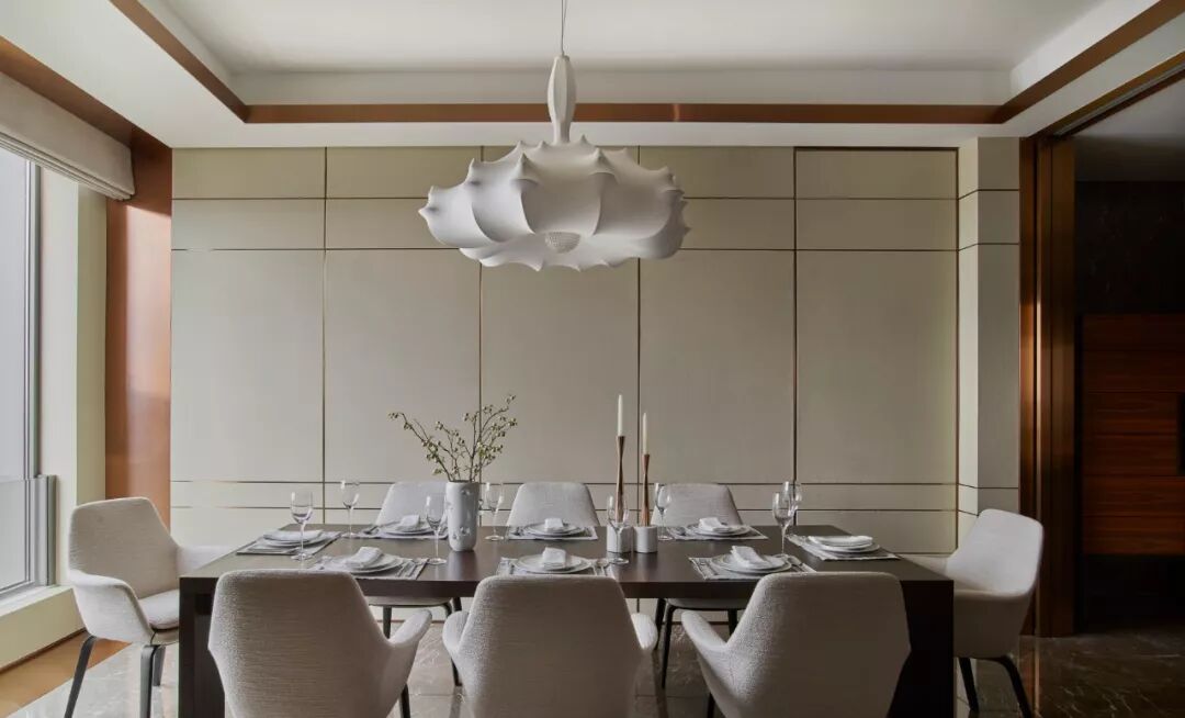 餐厅以高级灰皮革饰面铺呈,金属包边精确分割布局,静美的白色艺术吊灯柔和空间硬朗线条,花枝与烛台装点成趣,干净疏朗的氛围里弥漫着一丝浪漫情调。