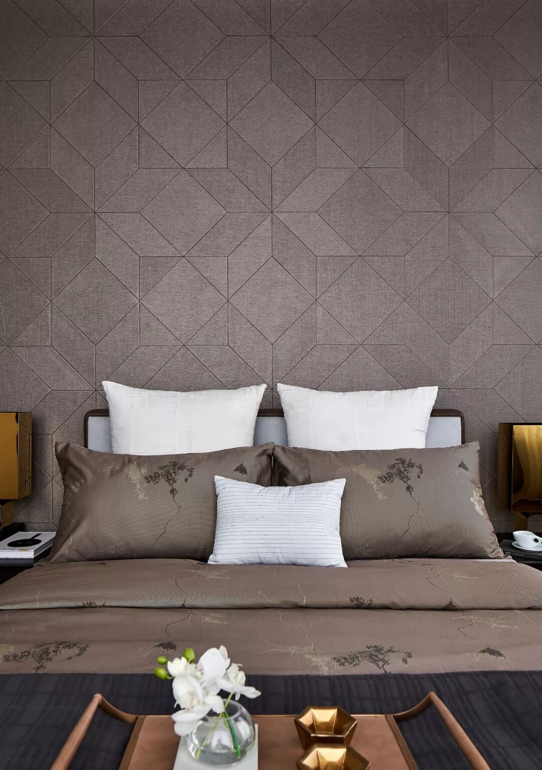 主卧采用块面混搭来塑造空间,壁布硬包经由U型内凹金属条的分割,一半浓烈、一半素雅,各具风情。半包围型床背由皮革嵌入木质,有效平衡立面视觉。