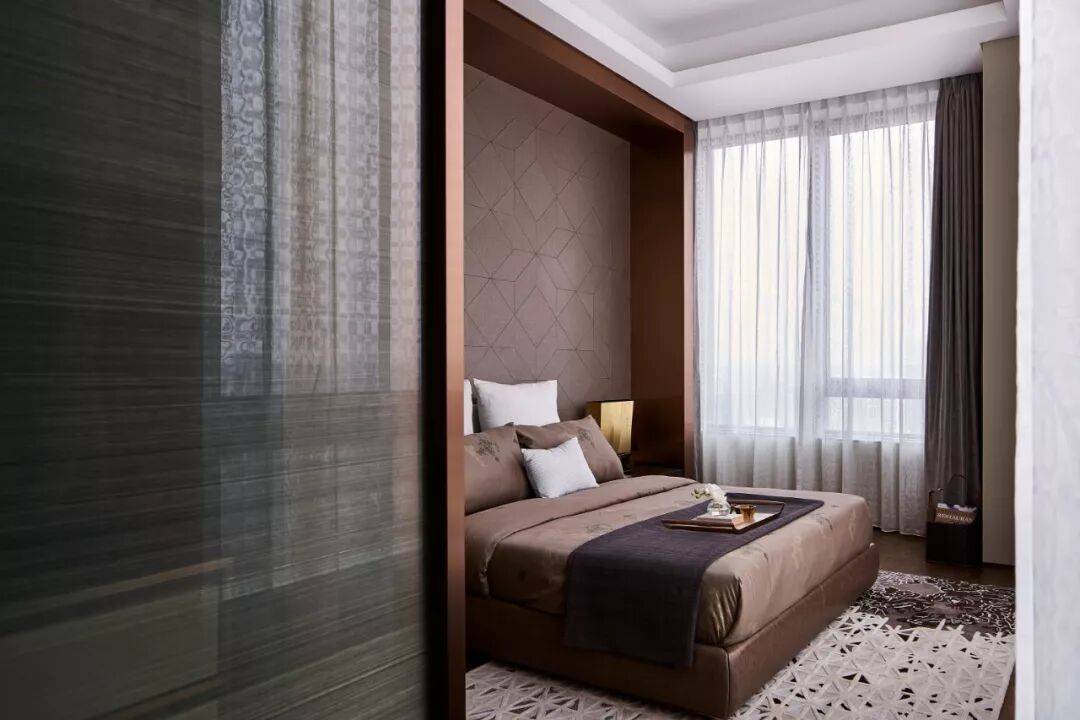 长辈房套间色调沉稳内敛,与主卧套间一脉相承的拼花背景墙被纳入其中,规整中又极具韵律变化。庄重华贵的深咖色床品静淌,调适出一种雅致心境。