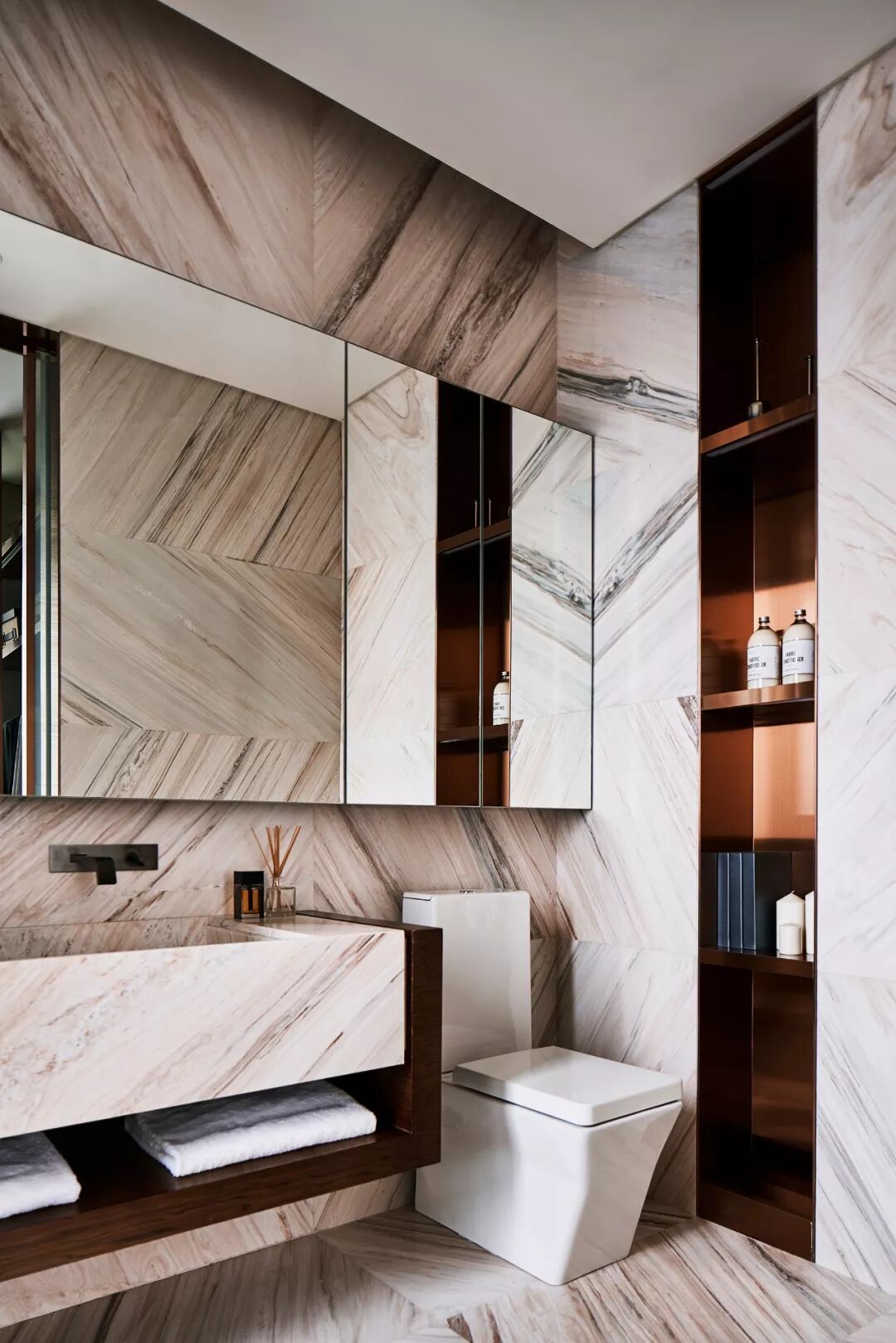 卫生间延续客厅背景墙风格,对纹大理石一体而上,右侧面利用建筑原始墙体打造金属展示架,兼具功能与美感。木质呈悬浮U型包裹台盆,映射出刚与柔的交融。