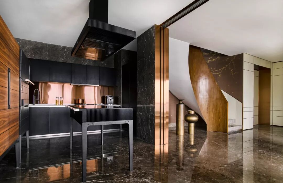 凭借对高端豪宅的深刻洞察以及驾轻就熟的操刀经验,设计师方磊以抽象现代的视觉符号探索原法租界的别样生机,“通过对地理位置的考察,将建筑与环境的共生特性融入到材质的变化中,寻求一种对撞与平衡之法,尽展繁华都市风貌。”方磊如此概述其设计宗旨。