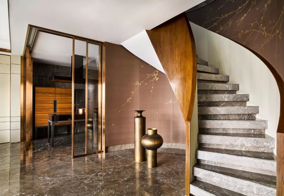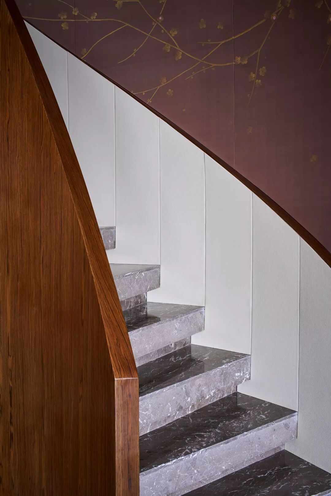 弧形楼梯蜿蜒而至,古铜摆件与立面手工壁纸自成一景。台阶拾级而上,将室内与顶端露台相连接,深色木材与皮革混搭,彰显出对缝手法的魅力,让情绪在不经意间释放。