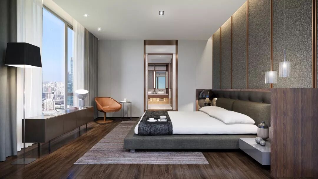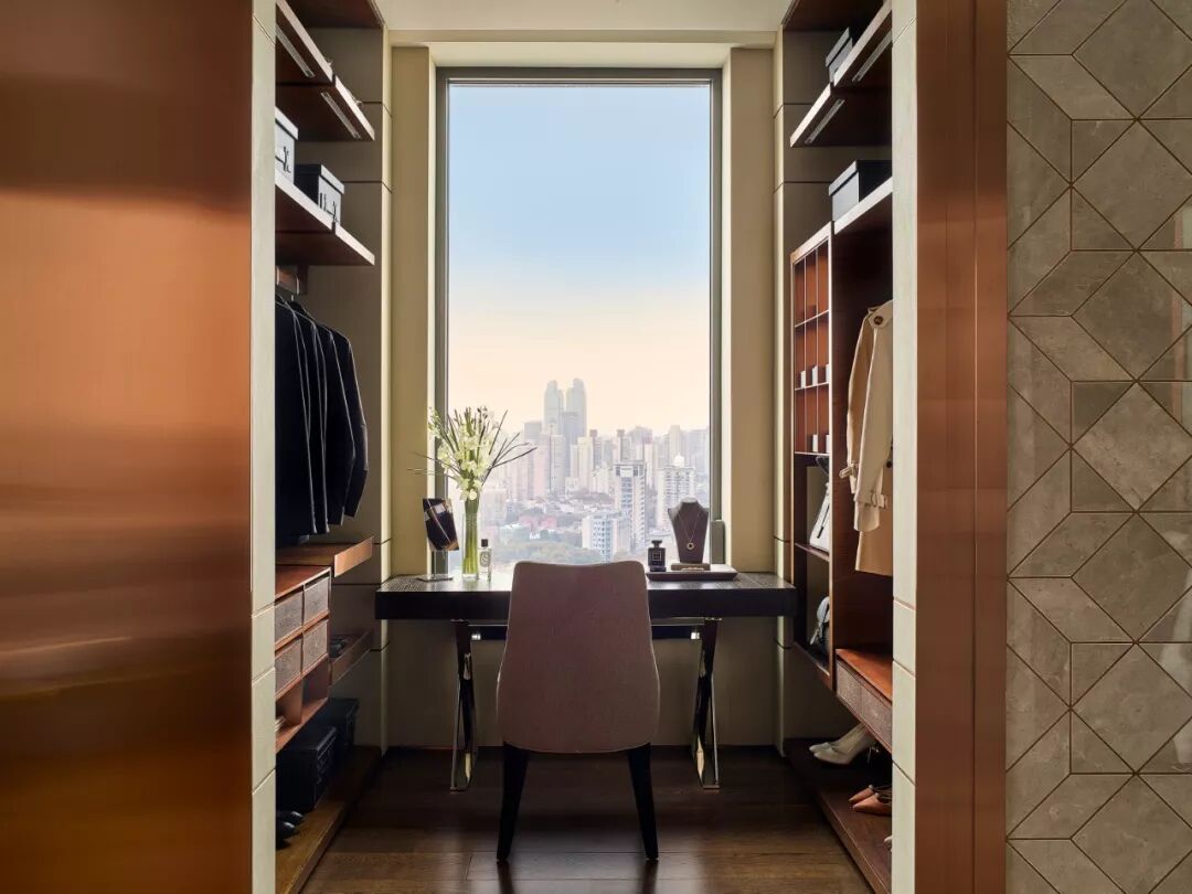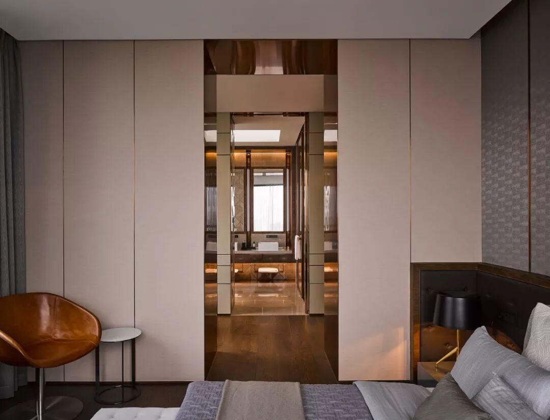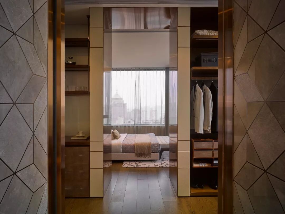 步入主卧套间,便可一览城市天际线,两侧开敞式衣帽间,以虚实错落的自由姿态,实现合理分格且各异其趣,对至高品位的追求正显露于此。