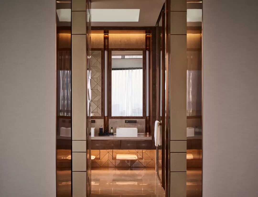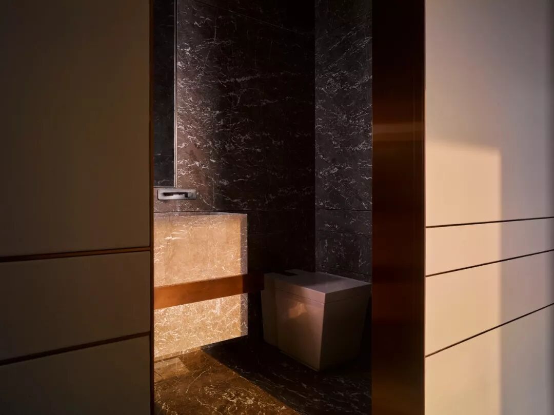线条继续指引,延向客卫区域,借由金属与石材体块穿插分割、恰到好处的比例把控凸显台盆。在镜面的映射下,这一隅点线面的呈现愈发丰盈。