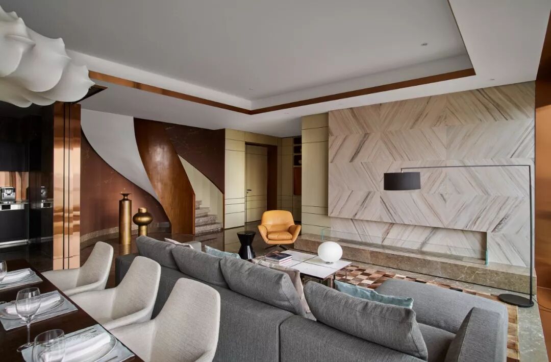 室内通过石材、金属、皮革等材质的融合与对比,形成风韵现代与优雅古典的对话,渲染出国际大都会的俊朗风度。客厅以对纹理手法打造背景墙,丰富视觉观感;壁炉升腾,暖意回升。窗外,精致璀璨的都市图景尽收眼底,坐卧之间,远观近袛,皆融入城市的热流。