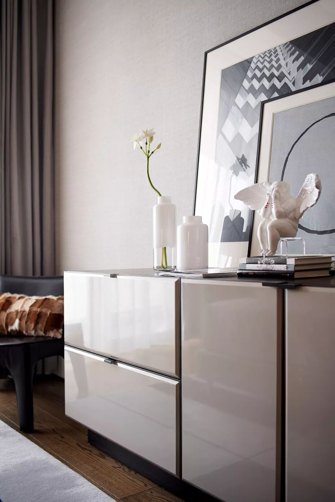 次卧在淡雅的灰色调中释放活力,透过一角的装饰画与摆件陈列,高低错落的秩序间尽显艺术氛围。