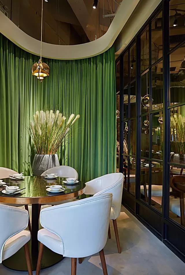 大面积的水泥面地面、墙面、丹麦经典的GUBI金属吊灯、运用白桦树作为屏风隐约的分割成了餐厅的几个区域,伴随着大自然最重要的颜色-草木绿色的窗帘、卡座皮革、植物作为空间点缀色,让空间大自然般的清新起来了,营业中的忙碌人气鼎盛犹如蒸汽般的与大自然对话。