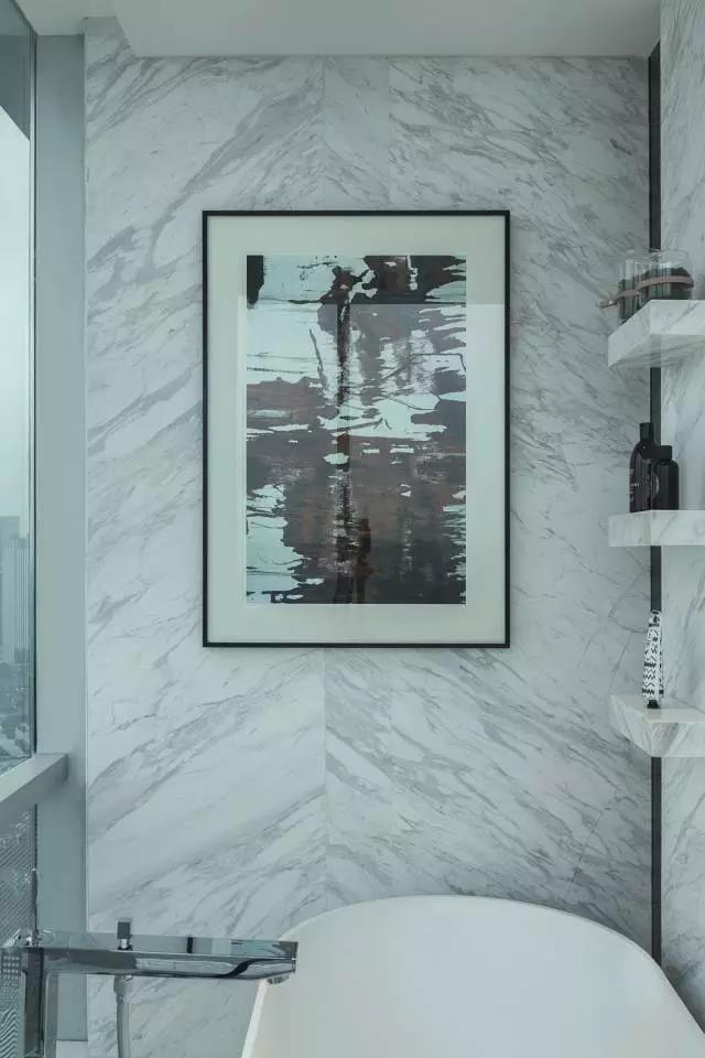 谁说在浴缸里不能享有欣赏艺术的权利?本案浴室即挂着来自泰国旅法艺术家Supachai从法国回到亚洲的成名作《walk to memory 时光漫步》,融合亚洲旧的墙壁、道路、家具、房子等有历史沉淀的元素,用当代艺术的手法表现出来。