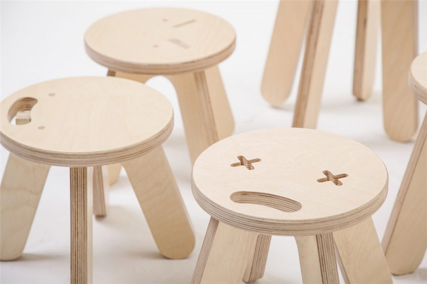 表情系列以凳面的不同表情的为特点,这也是“椅moji”名字的由来。二次元的表情包通过数控加工展现在实体家具上,让生活中的平常家具也生动起来。通过几种基本元素(眼睛、眉毛、嘴)的组合,可以获得丰富多样的表情,表达不同的心情。在形式之外,这些表情也跟功能和结构发生联系:嘴有时可以作为拿凳子的把手,眼睛有时候是固定凳面的木圆榫,而豁牙则是展现结构的榫卯节点。