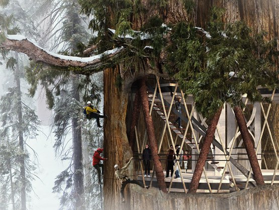 这个设计方案被称为“礼物:大纪念碑”(Tribute: The Monument of Giant)。这个有远见的方案设想在巨杉树干的空洞内建筑房屋,这种加利福尼亚红杉树原产于内华达山脉。建筑物将放置在心材腐烂的红杉树干内,防止这种古老的树木倒下。