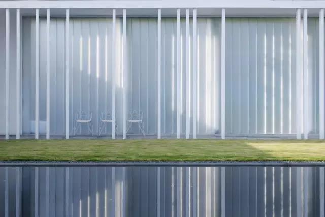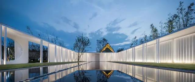 从入口进入,整体的立面以留白的界面完整的延续,在层层的白、黑与朦胧的暮色中模糊了回廊与自然地界限。空间隐约捕捉东方的影子,又仿若山水画,将留白带入到现代性的重塑中。光影的序列与留白的空间融合与自然之中,似乎重新演绎着传统园林。