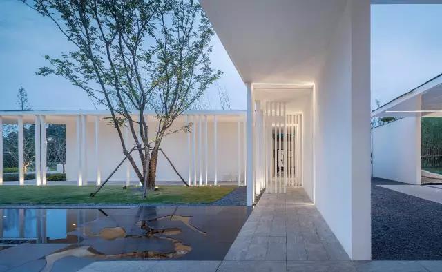 白色的入口门廊,跨越在明与暗之间,苍劲的迎客松巍然与入口一侧,一丝绿意薇薇探出,可以窥视到其中一角,这种犹如演出前的序幕,带给人一种恍惚而美好的感受。