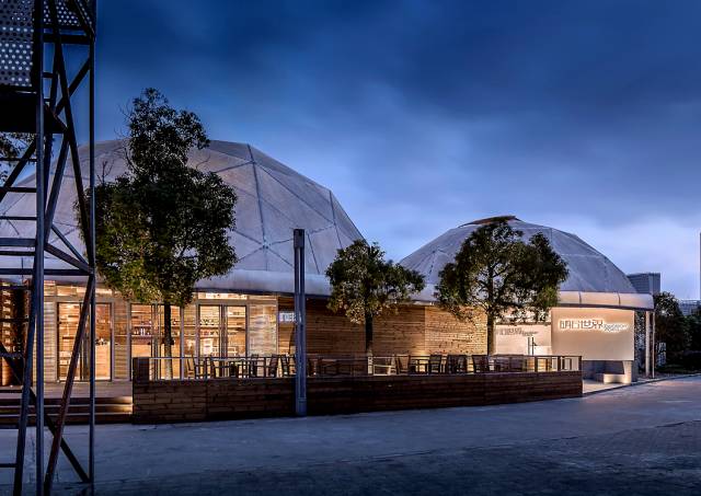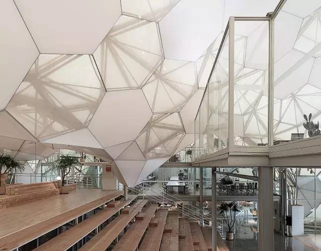 另外,原有的建筑是单层膜结构,整个室内的能源损耗会很大,为了节省能源,同时,又能将现场球形网架的气势和裸露结构的美感保留下来,我们跟材料公司协商后,在室内加多了一层透明膜。