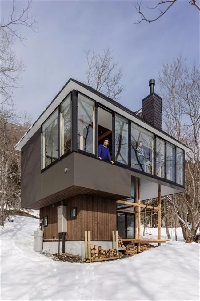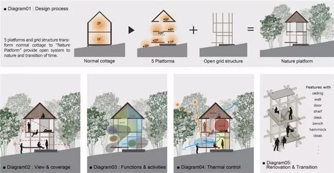 5个不同尺寸、高度和材质的平台承担了从地面、桌面、座椅、床板、架子、观景平台、阳台到屋顶的一系列功能,并根据起伏的森林景观带来不同的开放空间、室内环境以及视角。这些交叠的平台对景观、场地、建筑、家具和物品的层次秩序进行了重新排布,在自然环境中构成全新的起居空间。