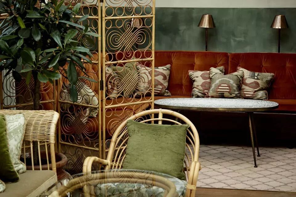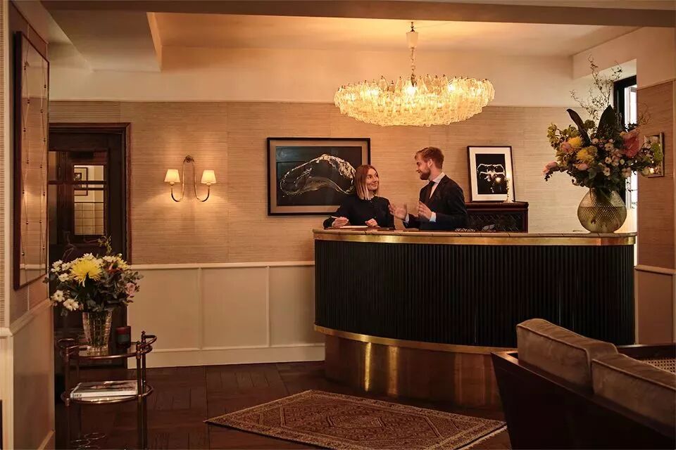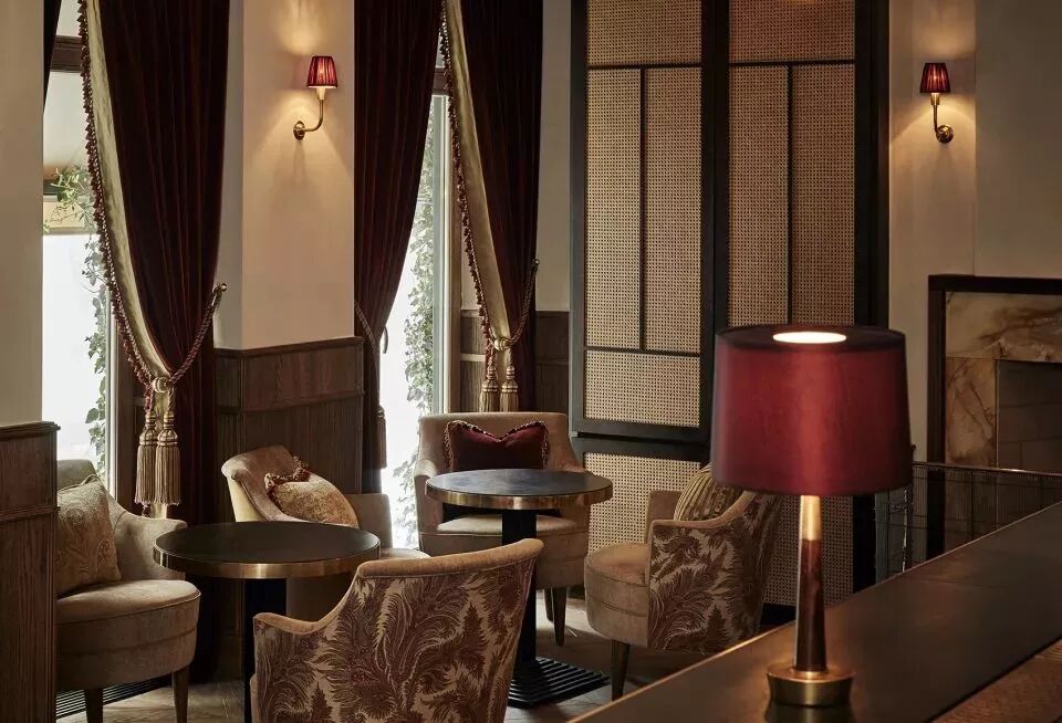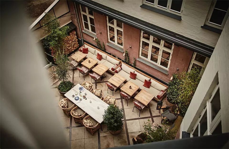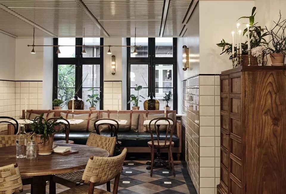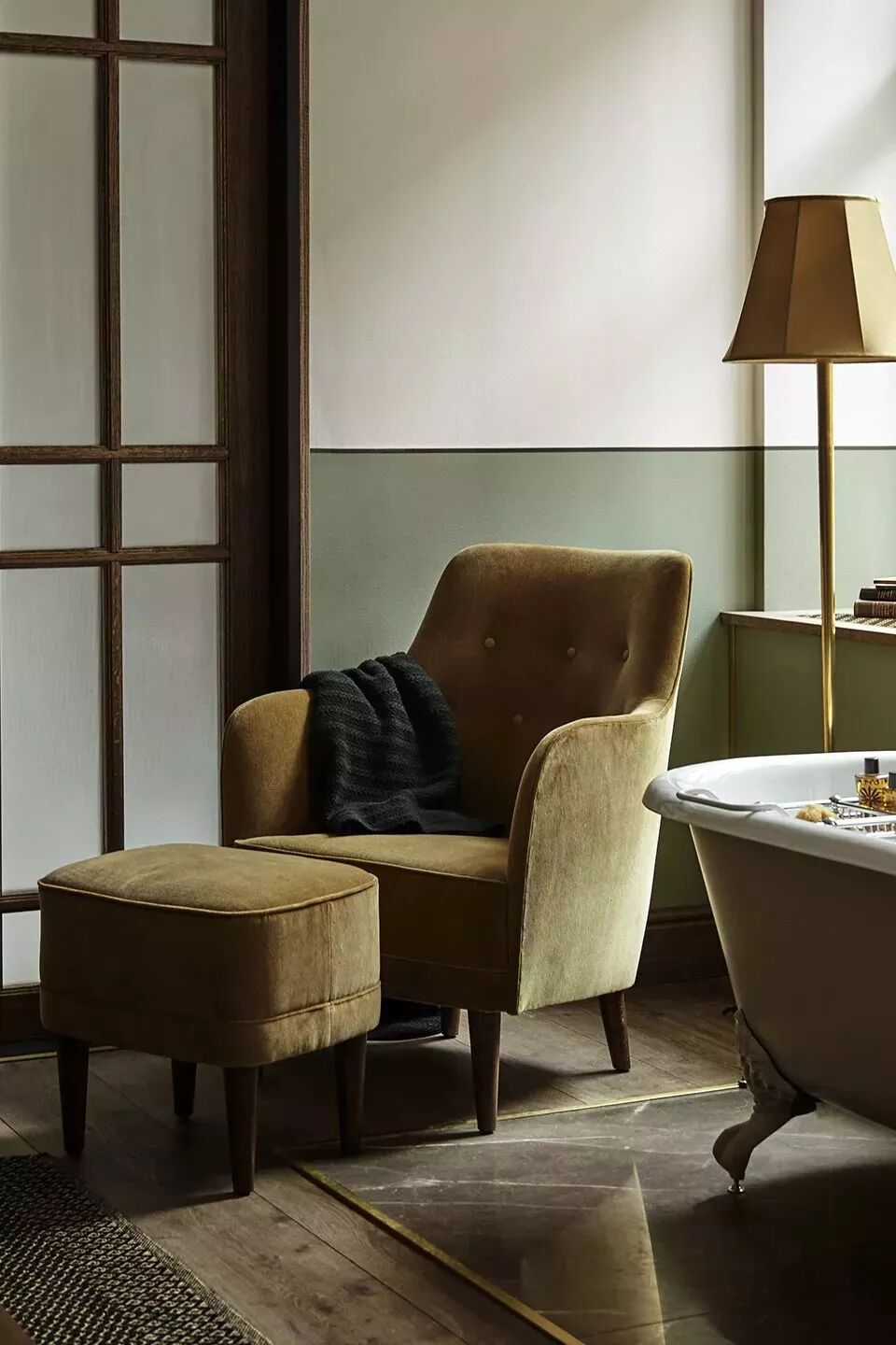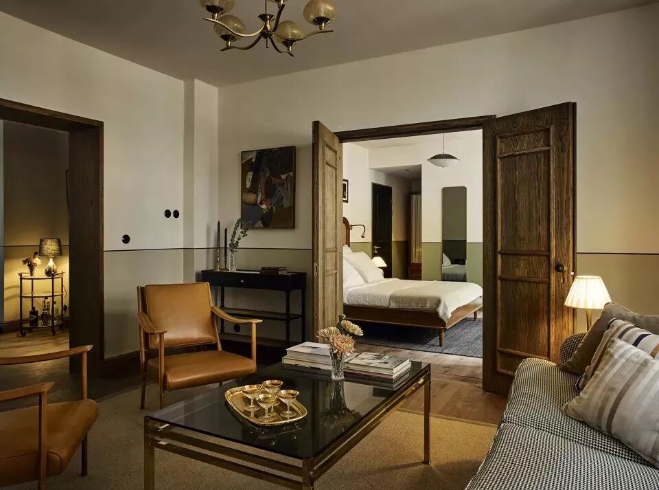 设计师为客房等较为安静的区域引入了中现代的丹麦设计风格,营造出家一般的氛围。虽然整个酒店中充斥着多种色彩,但依旧保持了细腻而低调的观感。室内空间并未使用当下流行的色彩,而是以大地色系和白垩色系为主,旨在呼应木材和石材的天然质感,传递出一种永恒的气息。公共区域还使用了一些独特的颜色,例如Tata酒吧的红色丝绒窗帘,酒店餐厅Sanders Kitchen的墨绿色皮革座椅,以及前台区域的金色丝绒沙发。