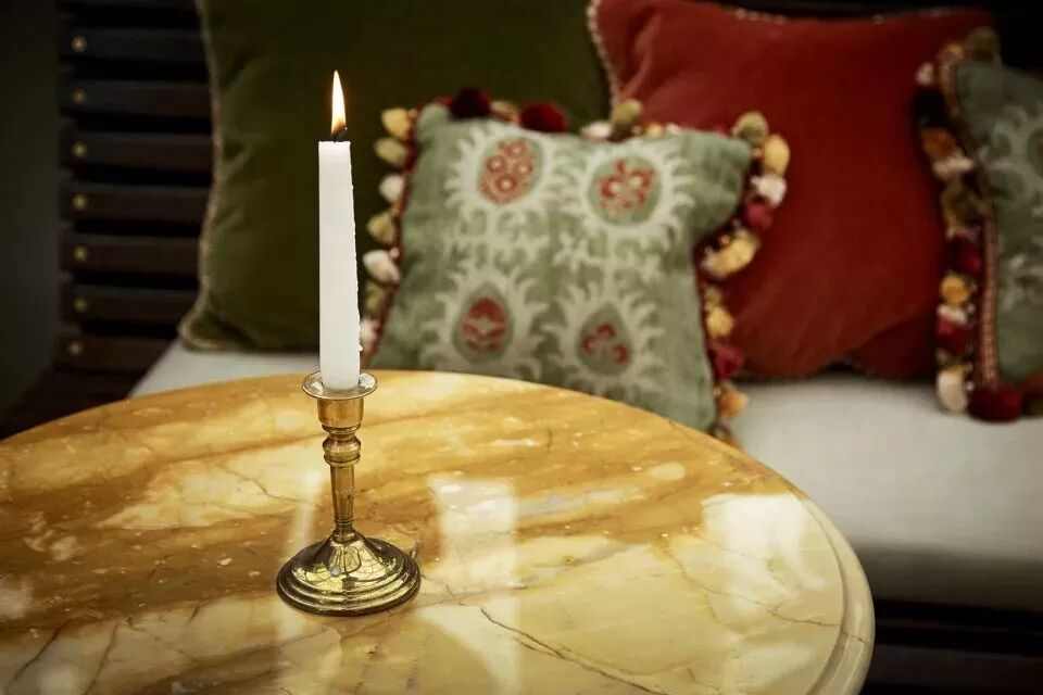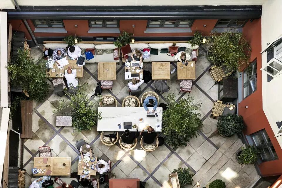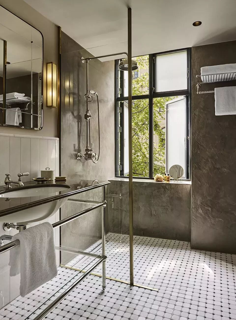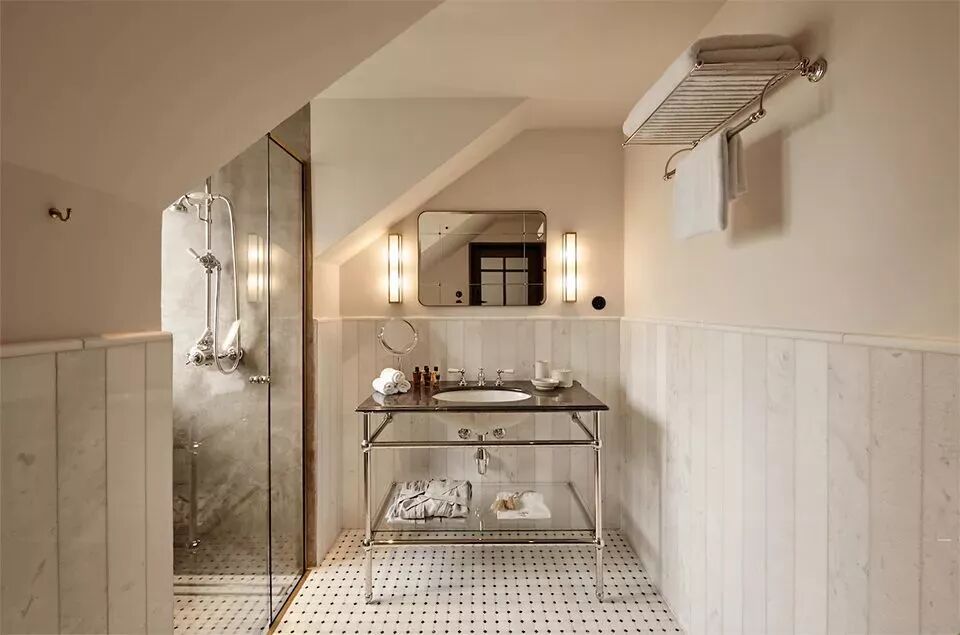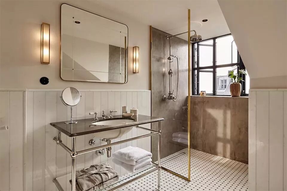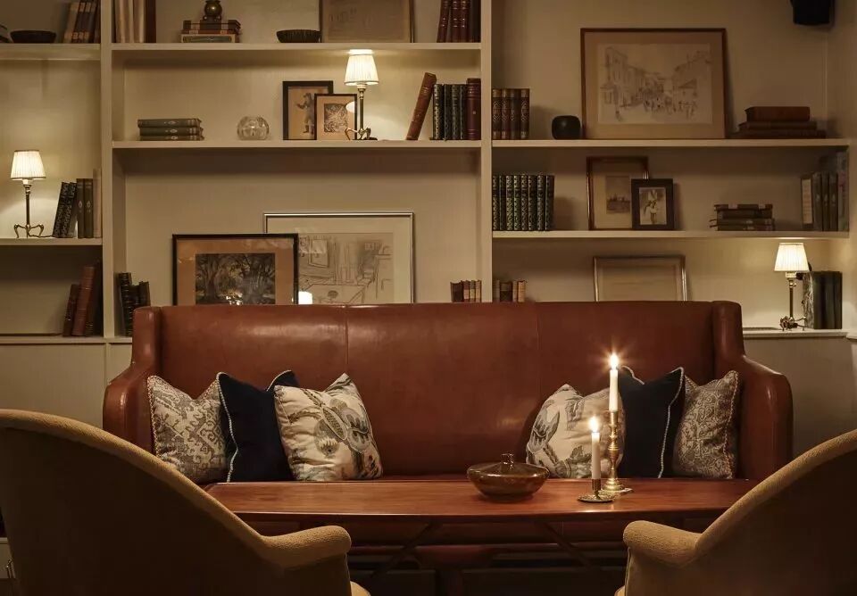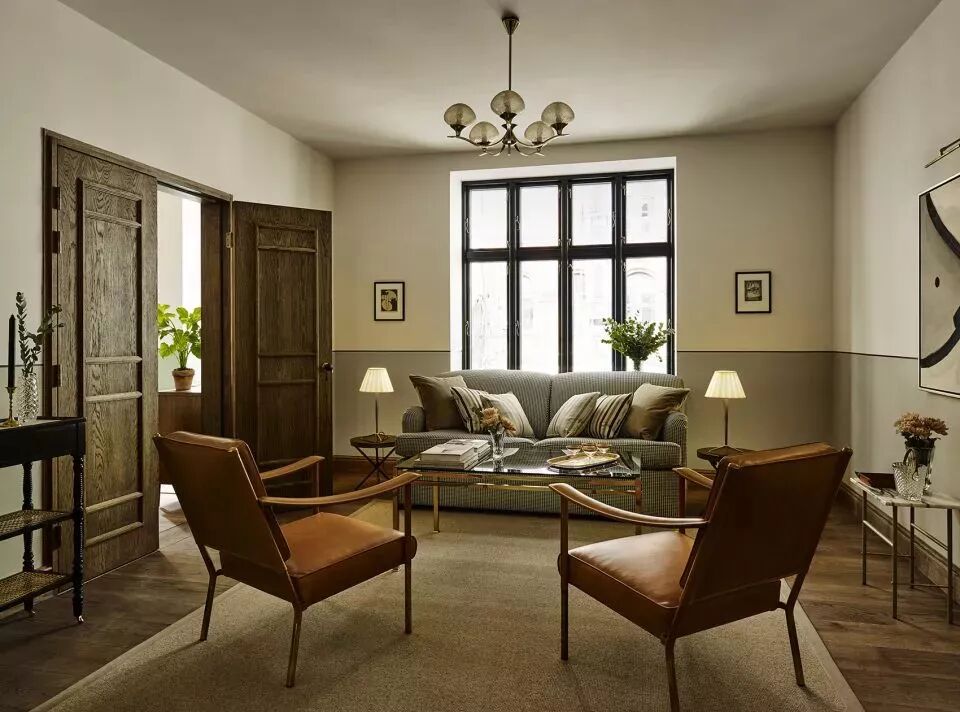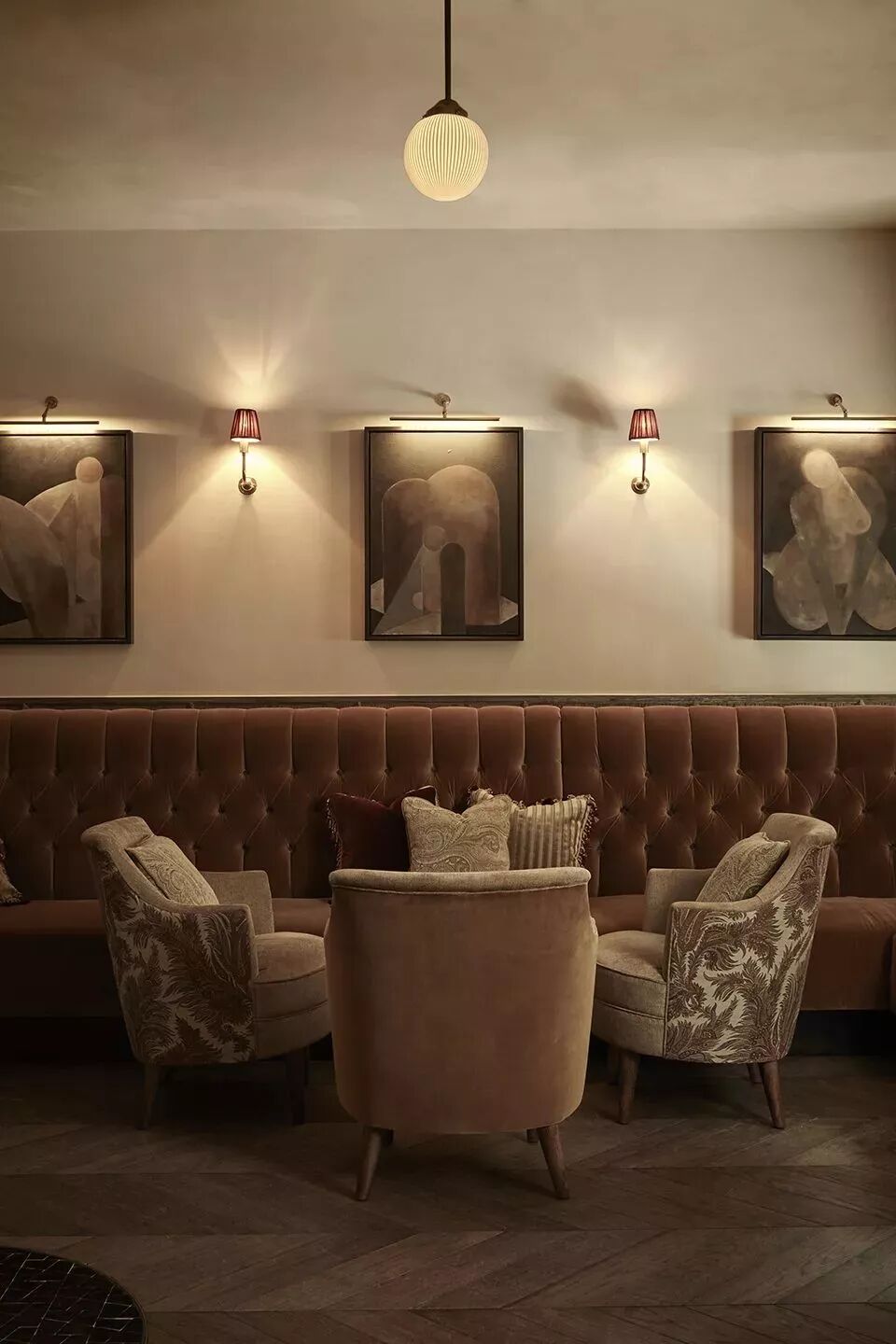 设计师为客房等较为安静的区域引入了中现代的丹麦设计风格,营造出家一般的氛围。虽然整个酒店中充斥着多种色彩,但依旧保持了细腻而低调的观感。室内空间并未使用当下流行的色彩,而是以大地色系和白垩色系为主,旨在呼应木材和石材的天然质感,传递出一种永恒的气息。公共区域还使用了一些独特的颜色,例如Tata酒吧的红色丝绒窗帘,酒店餐厅Sanders Kitchen的墨绿色皮革座椅,以及前台区域的金色丝绒沙发。