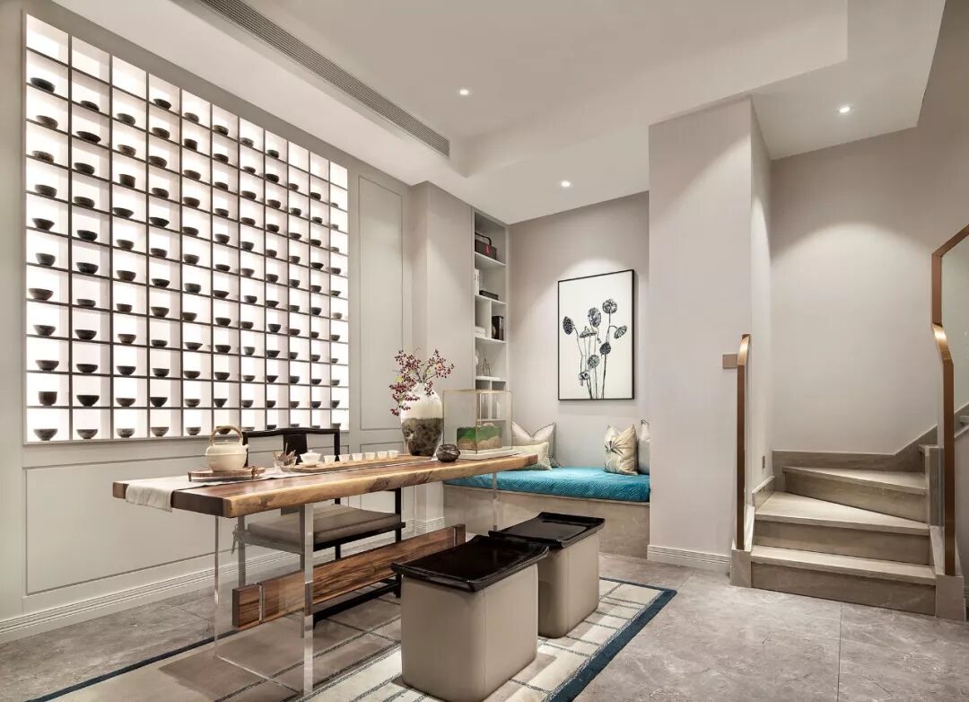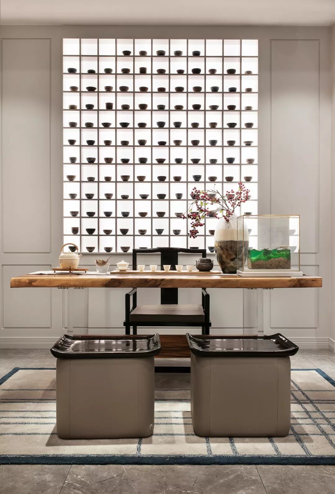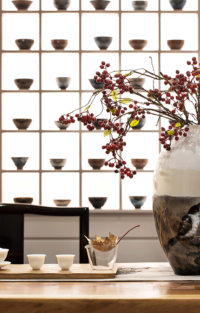 诗意绵长的茶室是家屋里一处可烹茶会友的小天地,其间的闲趣不言而喻。收藏架上摆放着各式福建建盏,散溢着古朴而素雅清冽之感,花果沁香,茶香浓郁,为生活加入了些许清雅况味。