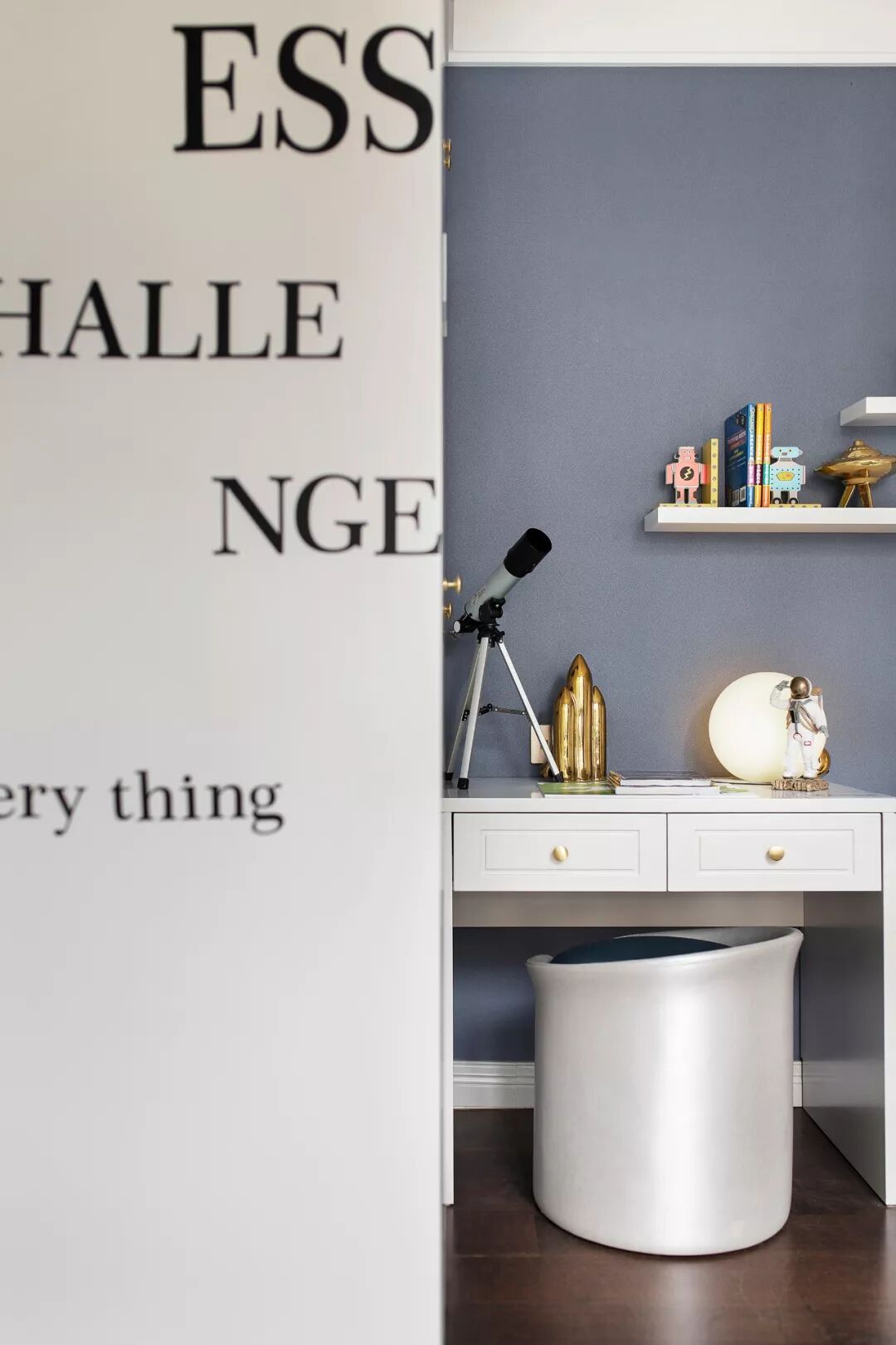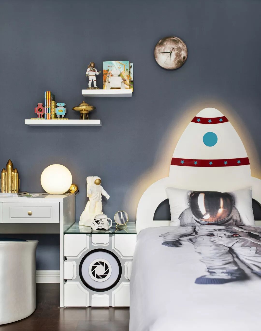 儿童房是宇宙太空的科幻主题,带有灰调的蓝色在空间中以丰富的层次、不一的功能呈现展演,更为耐看的陈设色调可以经得起小男孩心智的成长变化。随处可见的STARWARS周边、月球造型钟表和灯、太空舱床头柜与发光背景,搭载着小朋友稚嫩而精彩的梦,空间变得美好而富有童趣,是童年最为美好的生活馈赠。