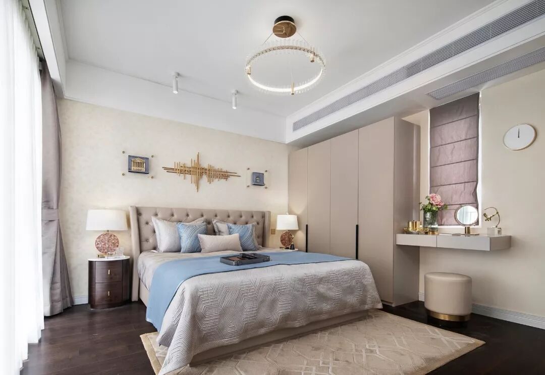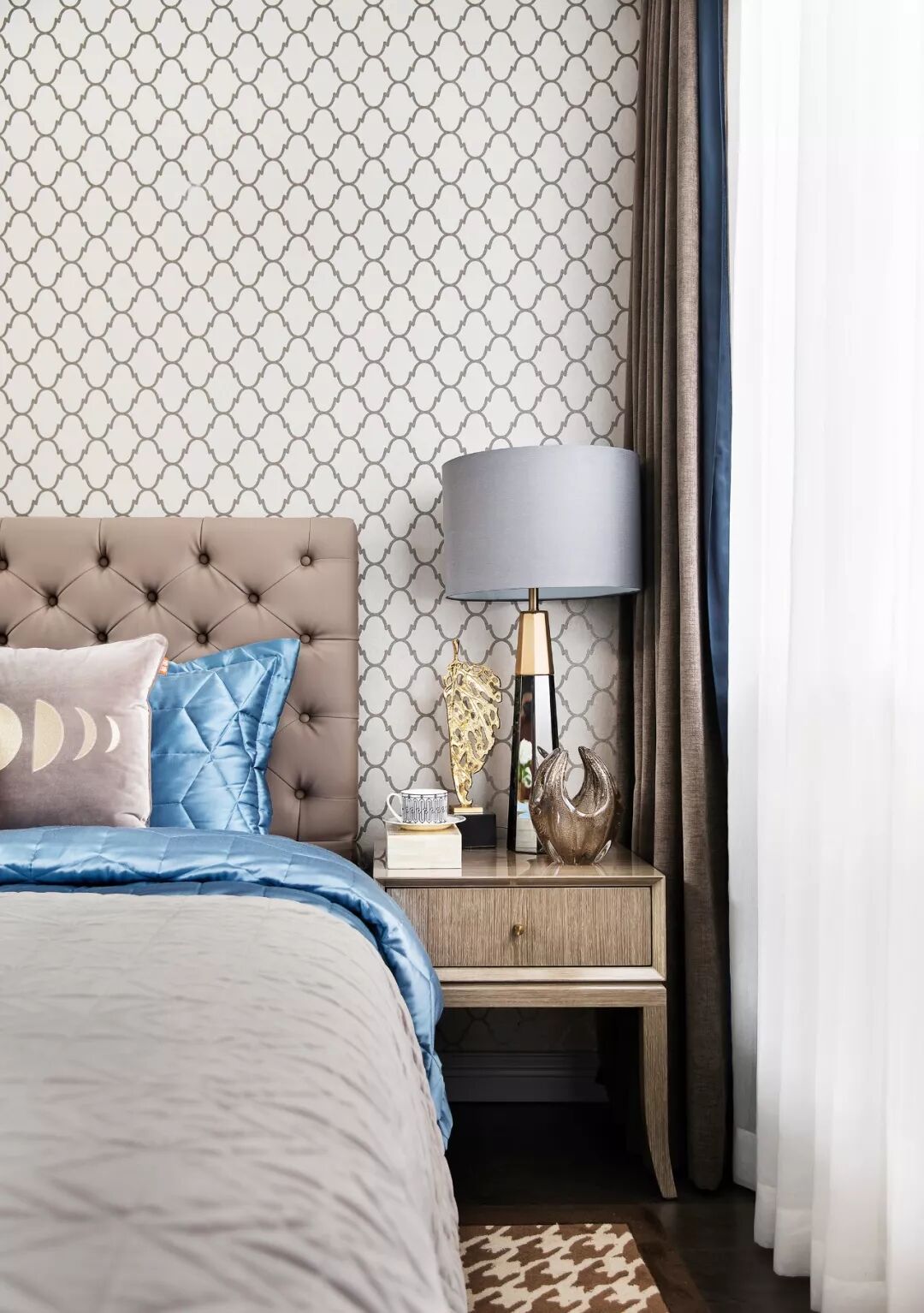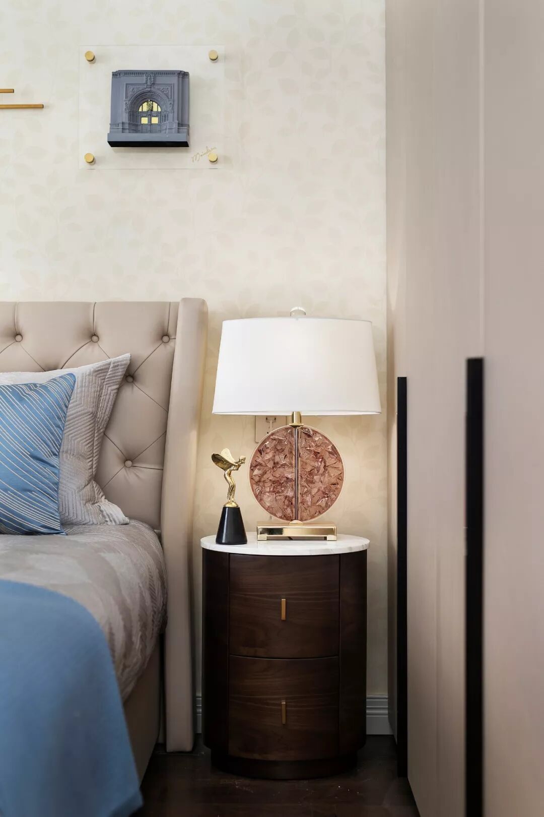 长辈房的设计选用亚麻色、灰蓝这些相对柔和的色调,契合老人家舒惬享老的生活心态。舒适亲肤的床品、精致的艺术饰件、甘甜芬芳的插花,营造亲和淳朴、安享自身的生活氛围。