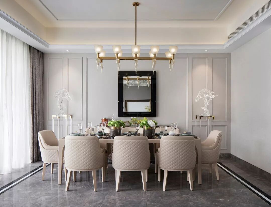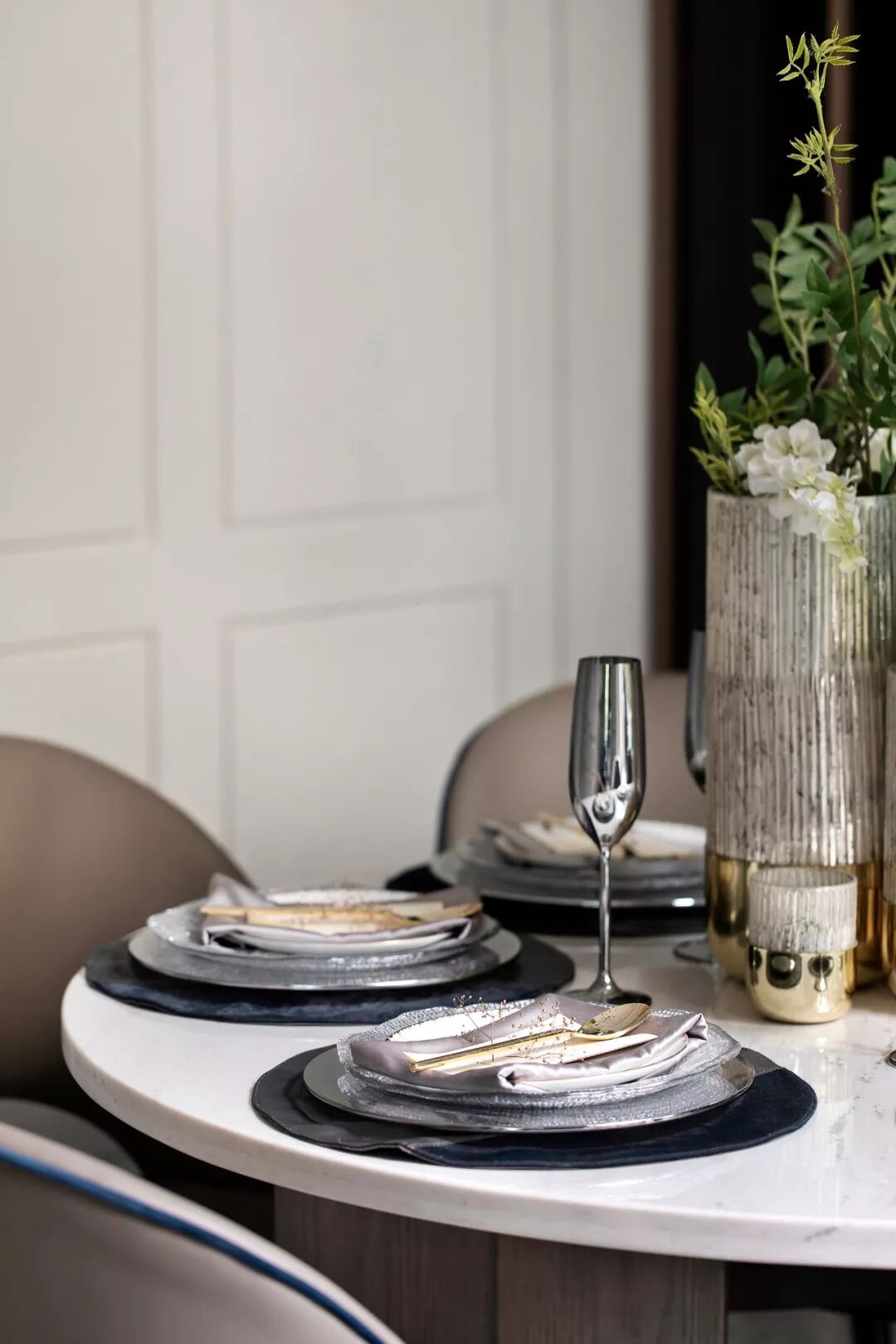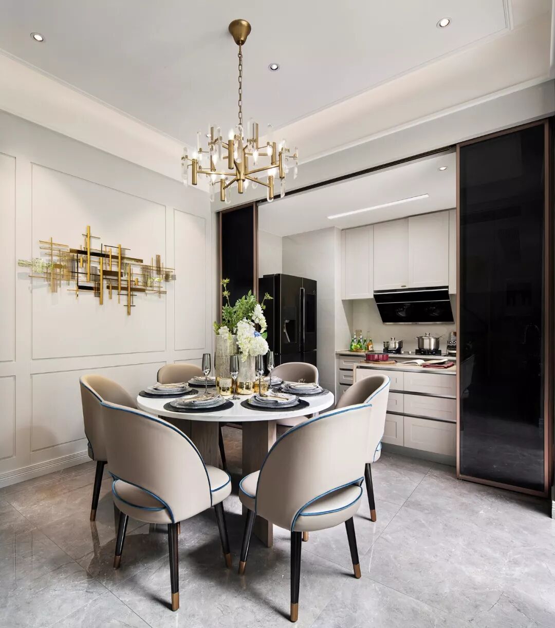 半开放式的厨房设计,自由切换中西厨模式,小型中岛柜补充更多的收纳空间,家人在这里一同料理,加载出更多亲昵的生活场景。餐厅以围合的简式餐桌椅、纯净的水晶灯饰、精致的餐具与花艺,打造温馨喜乐的就餐氛围与生活的仪式感。