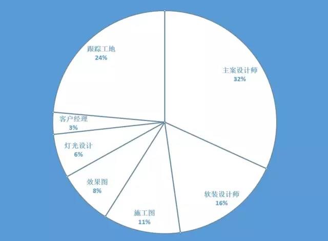 再看跟踪工地费用,除了灯光设计师和效果图制作人员不用跟踪工地,其他设计师都需要与工地结合,才能控制效果。小工程一般以两个月为一个施工周期,虽不会占用设计师全部时间,但图纸变更、与客户沟通、与工人沟通都需要时间和精力,而这个周期也会把设计师精力拉扯的很锁碎。按照占用设计师20%的时间计算成本(施工图7000+软装10000+主案20000+客户经理2000)X2月X20%=施工跟踪费用15600元。