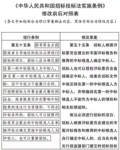 编者注:修改前的条例是“招标人应当确定排名第一的中标候选人为中标人。”修改后,中标人的确定除排名第一的中标候选人之外,也可以由招标人通过授权评标委员会直接确定。