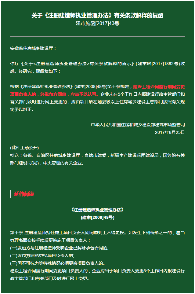 9月7日,住建部发文关于《注册建造师执业管理办法》有关条款解释的复函,明确回复:建设工程合同履行期间变更项目负责人的,经发包方同意,应当予以认可。企业未在5个工作日内报建设行政主管部门和有关部门及时进行网上变更的,应由项目所在地县级以上住房城乡建设主管部门按照有关规定予以纠正。