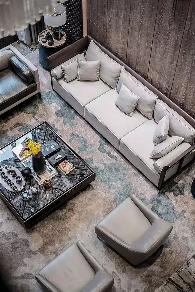 家庭厅布局开阔,未设隔断区分各区域,增强气息流通,以消弭空间界限,打散空间秩序的串联,来完成视觉维度的延伸,放眼望去视野开阔,空间井然有序。此空间广而高,块面间木饰面与扪皮完美结合,用于分隔和柔化转角的不锈钢条避免了颜色的单一,金属色亮片为空间增添一丝灵动性。