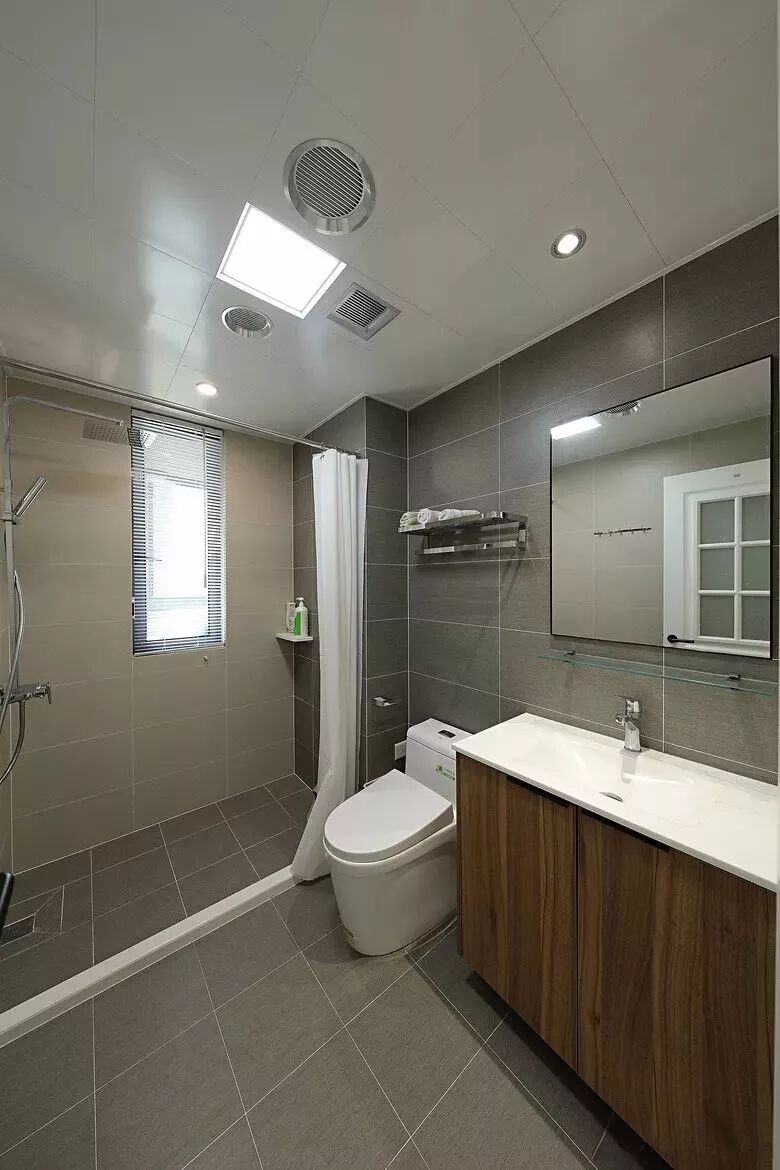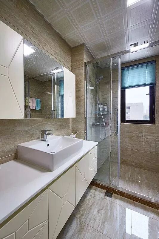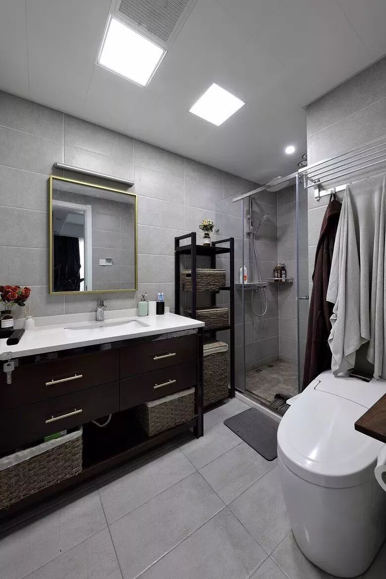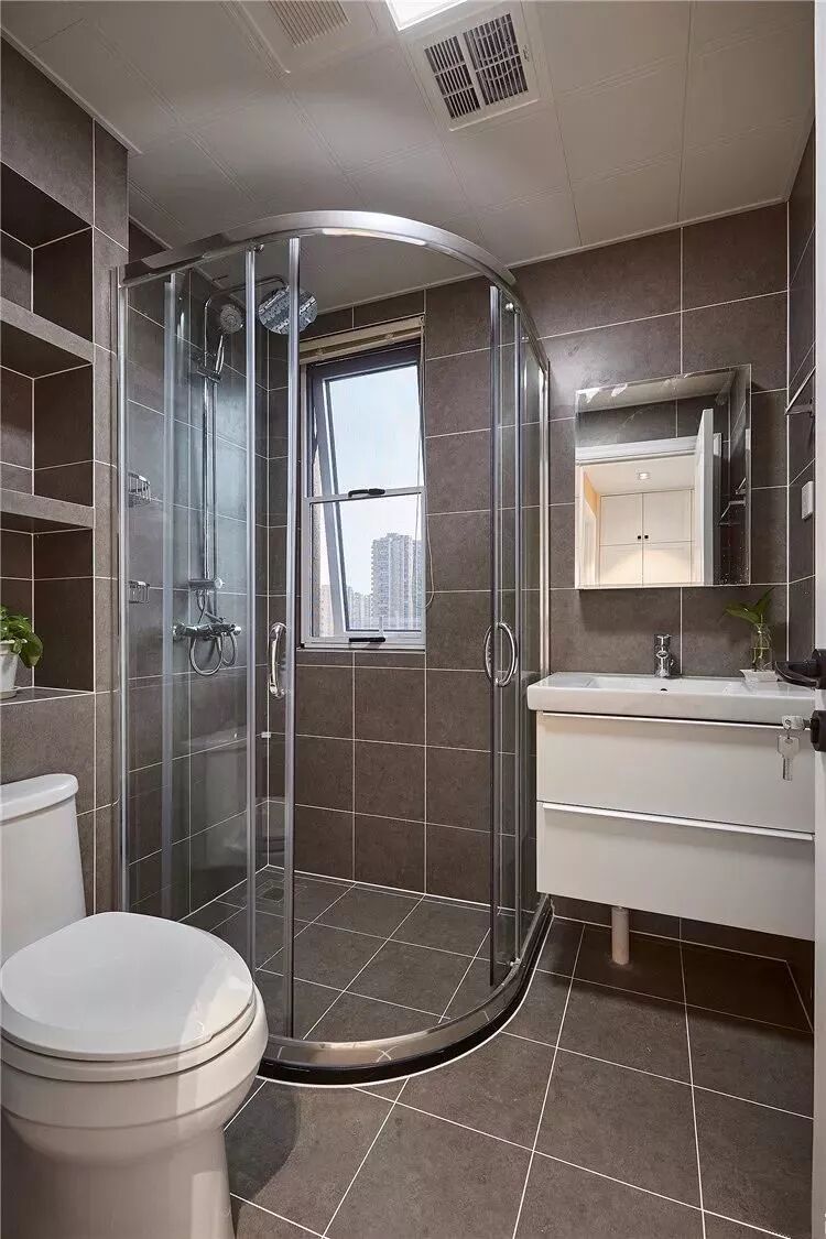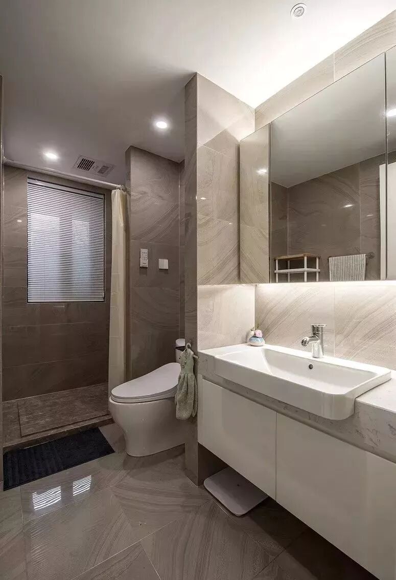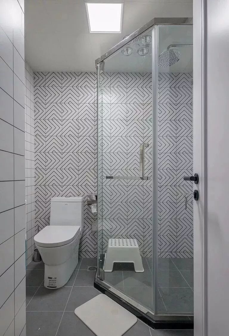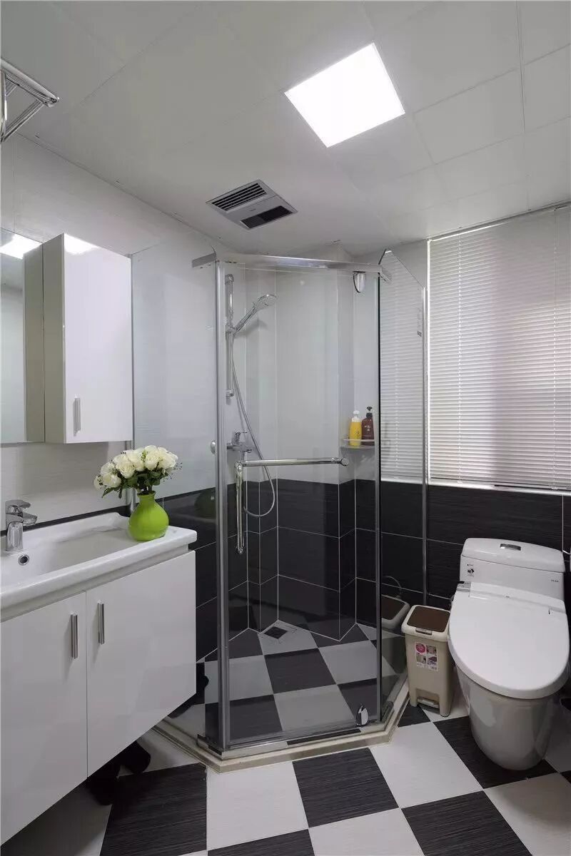 而一些比较方正的卫生间,一字排开的淋浴房、马桶、洗手盆是空间不足的,这个时候就可以以三角形的分布,这样在有限的空间内,同样可以保持通畅实用的功能。