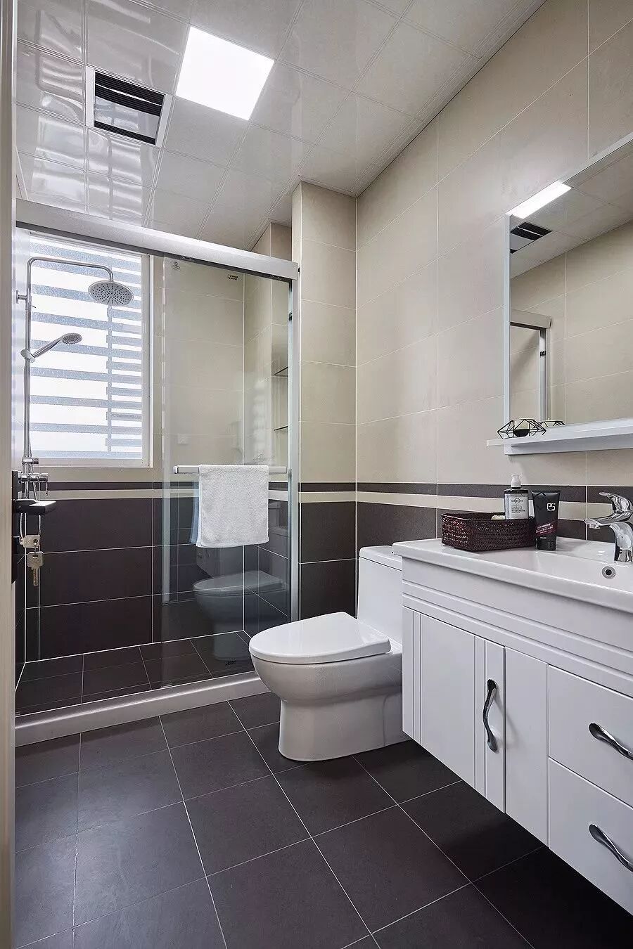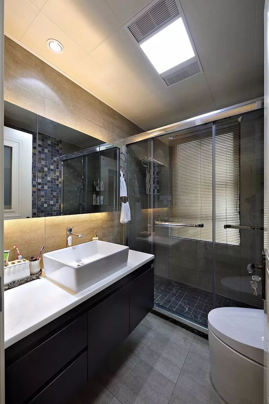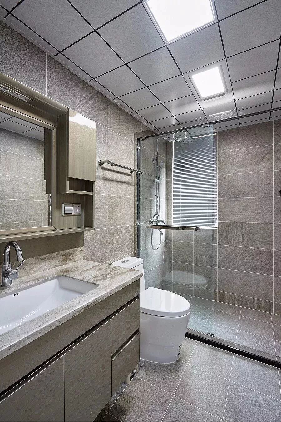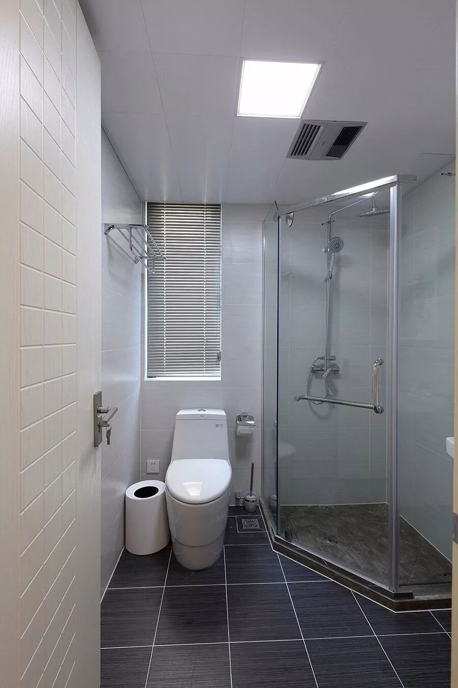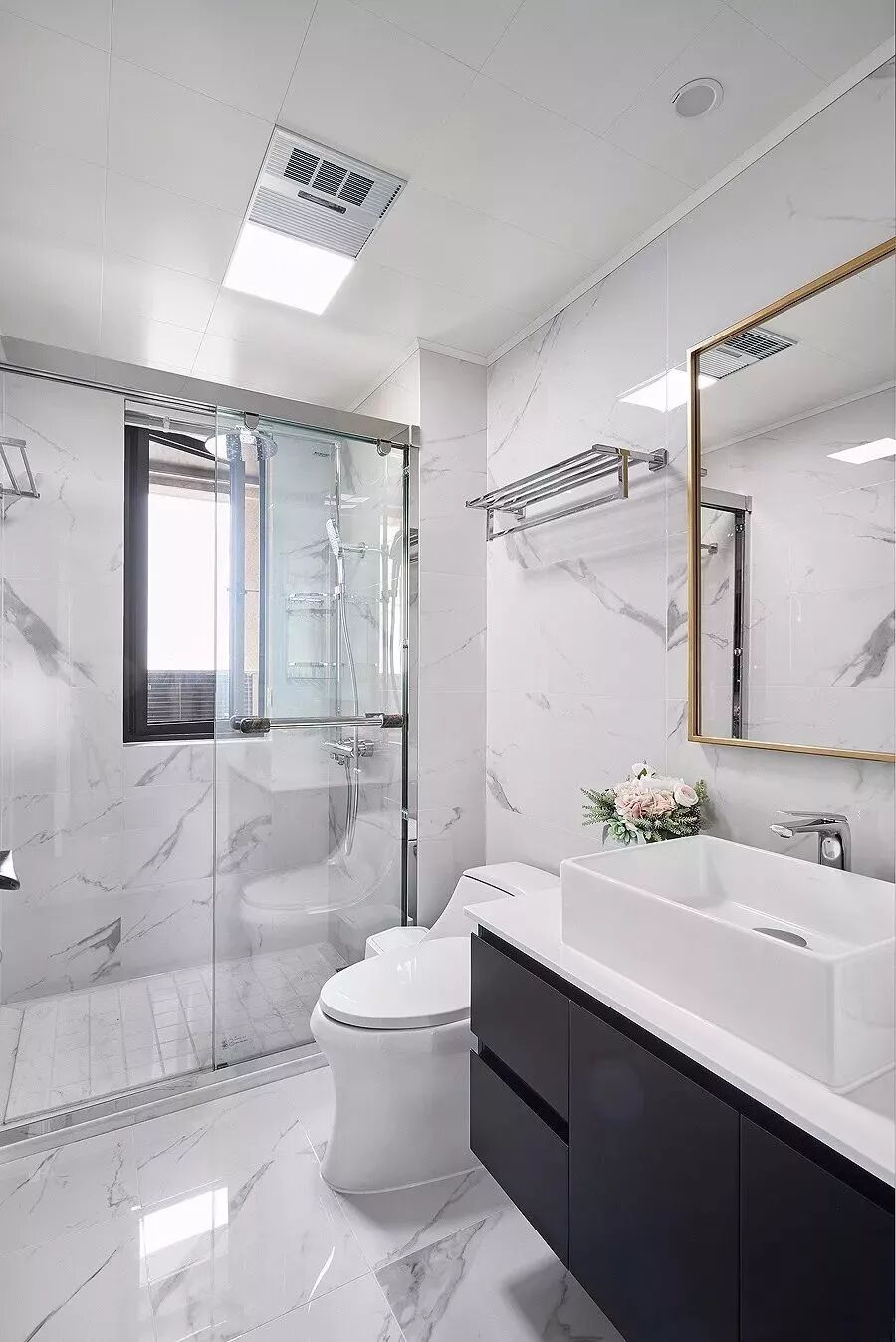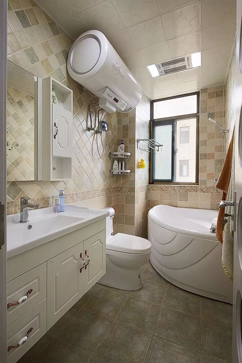 而一些比较方正的卫生间,一字排开的淋浴房、马桶、洗手盆是空间不足的,这个时候就可以以三角形的分布,这样在有限的空间内,同样可以保持通畅实用的功能。