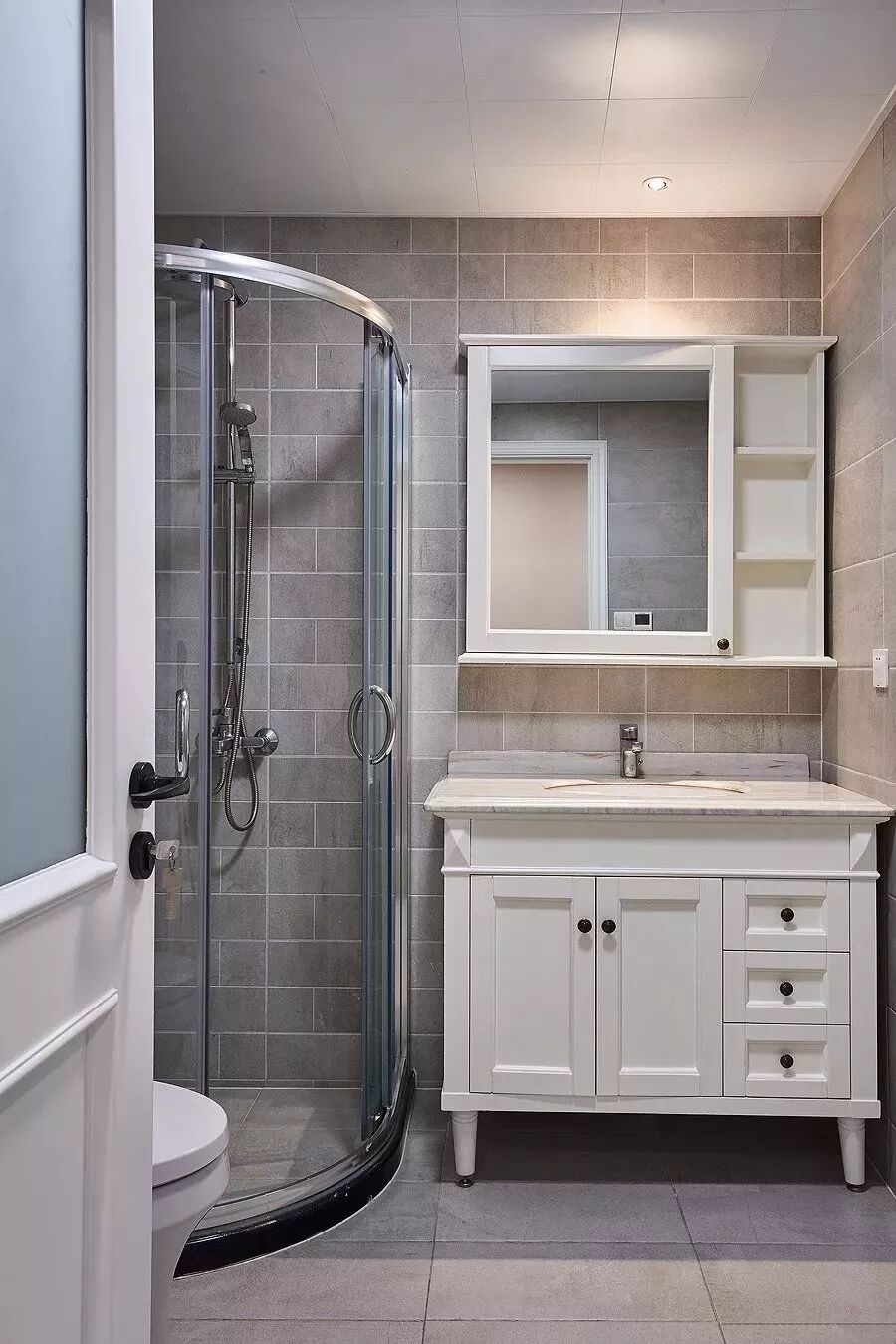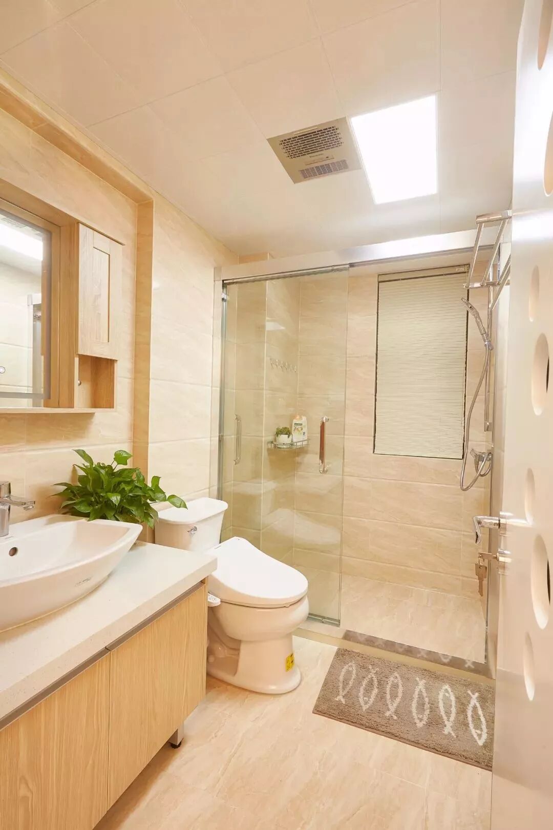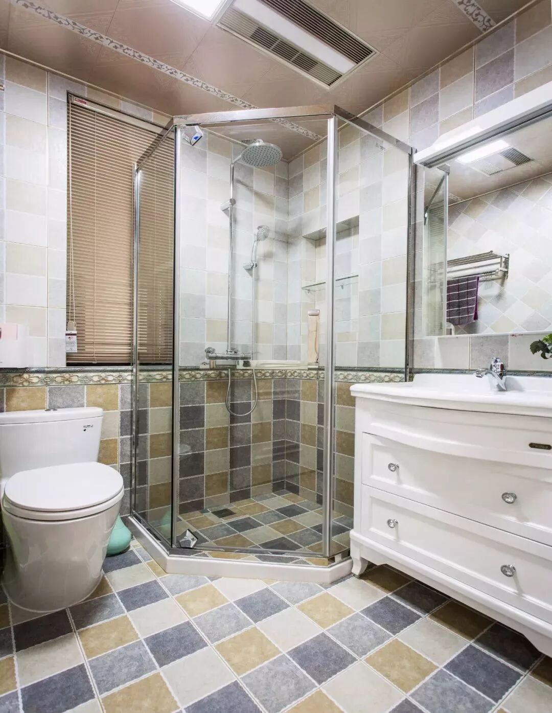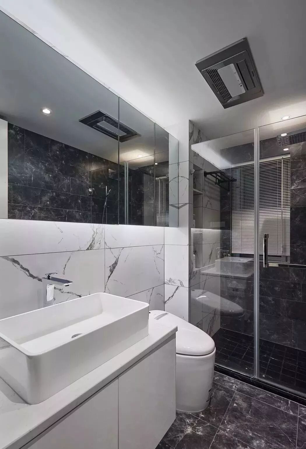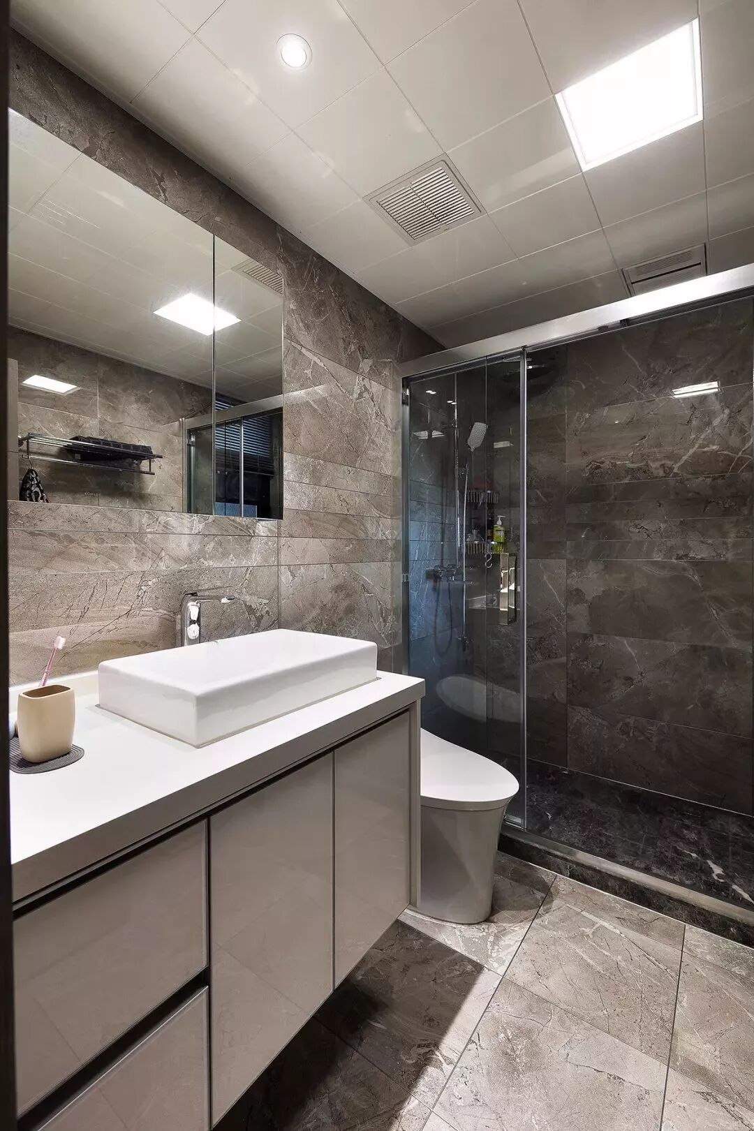 而一些比较方正的卫生间,一字排开的淋浴房、马桶、洗手盆是空间不足的,这个时候就可以以三角形的分布,这样在有限的空间内,同样可以保持通畅实用的功能。