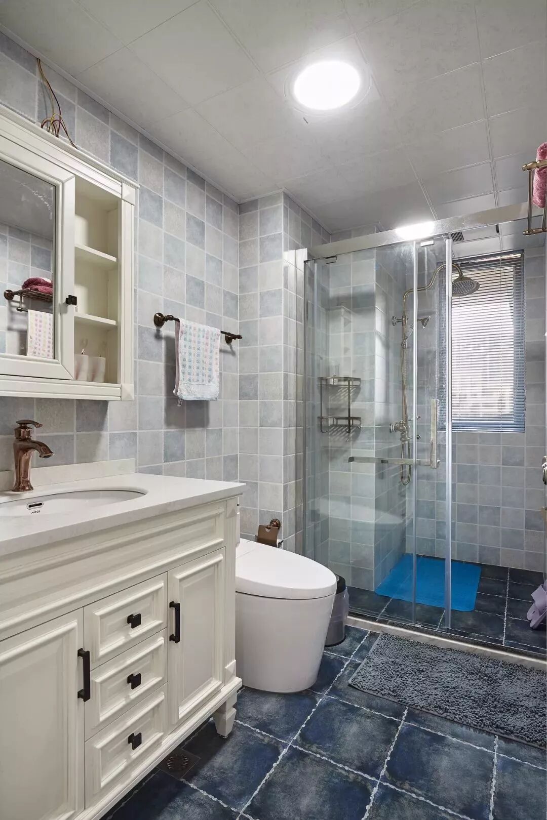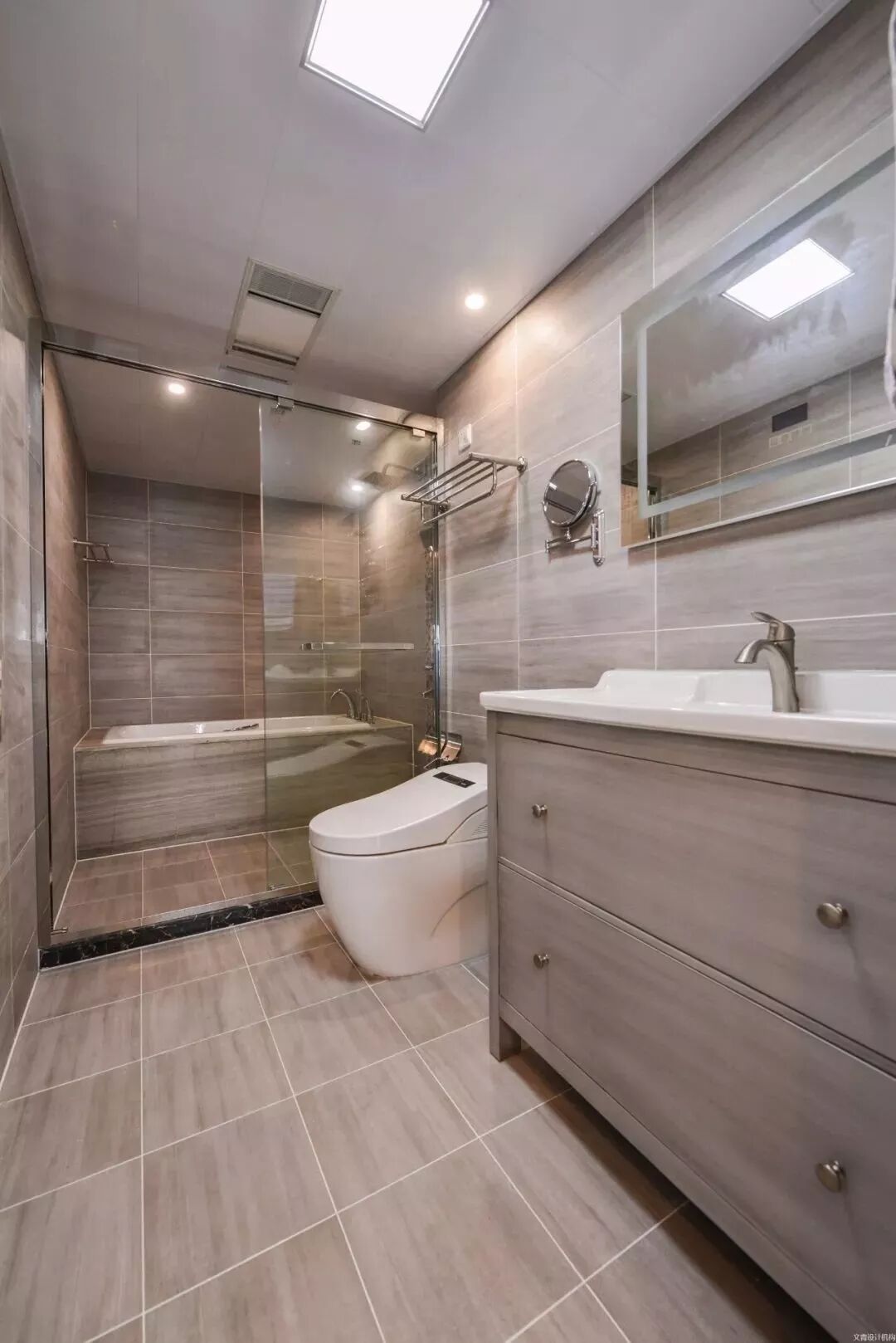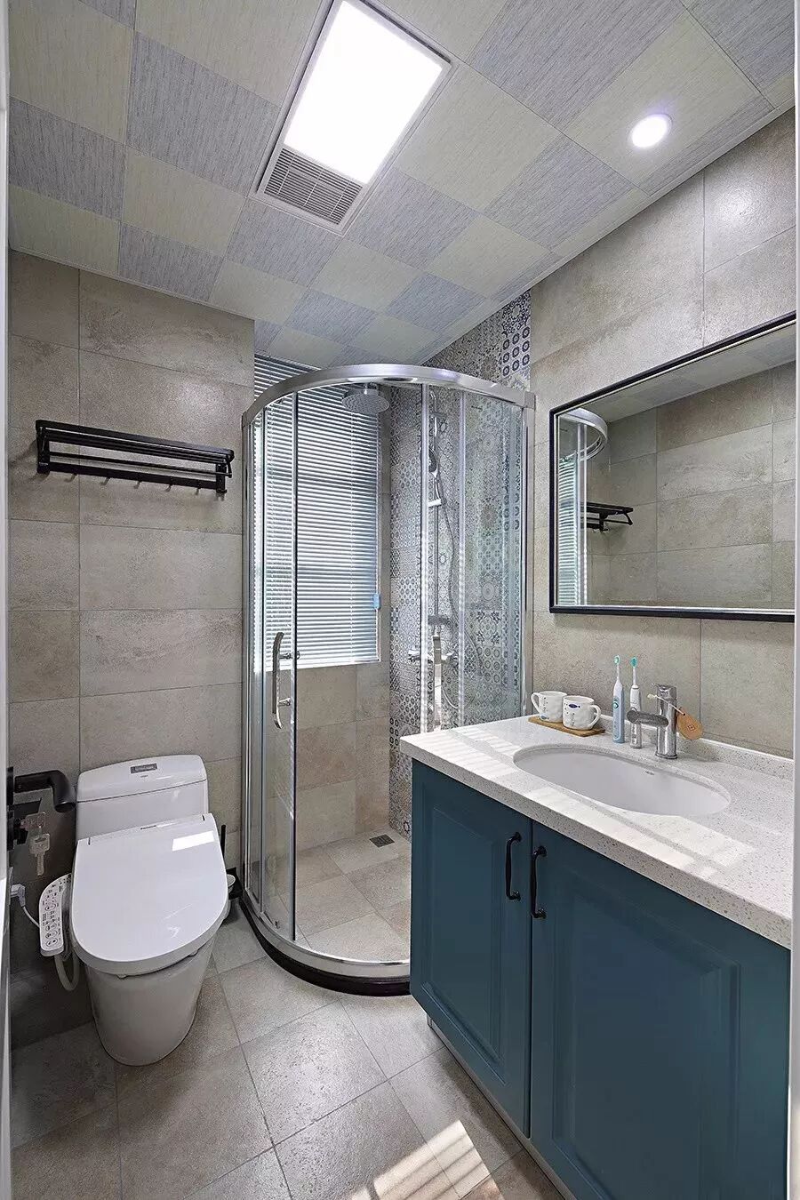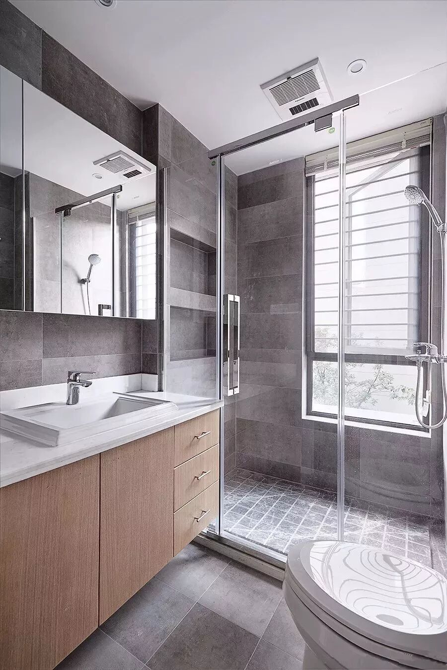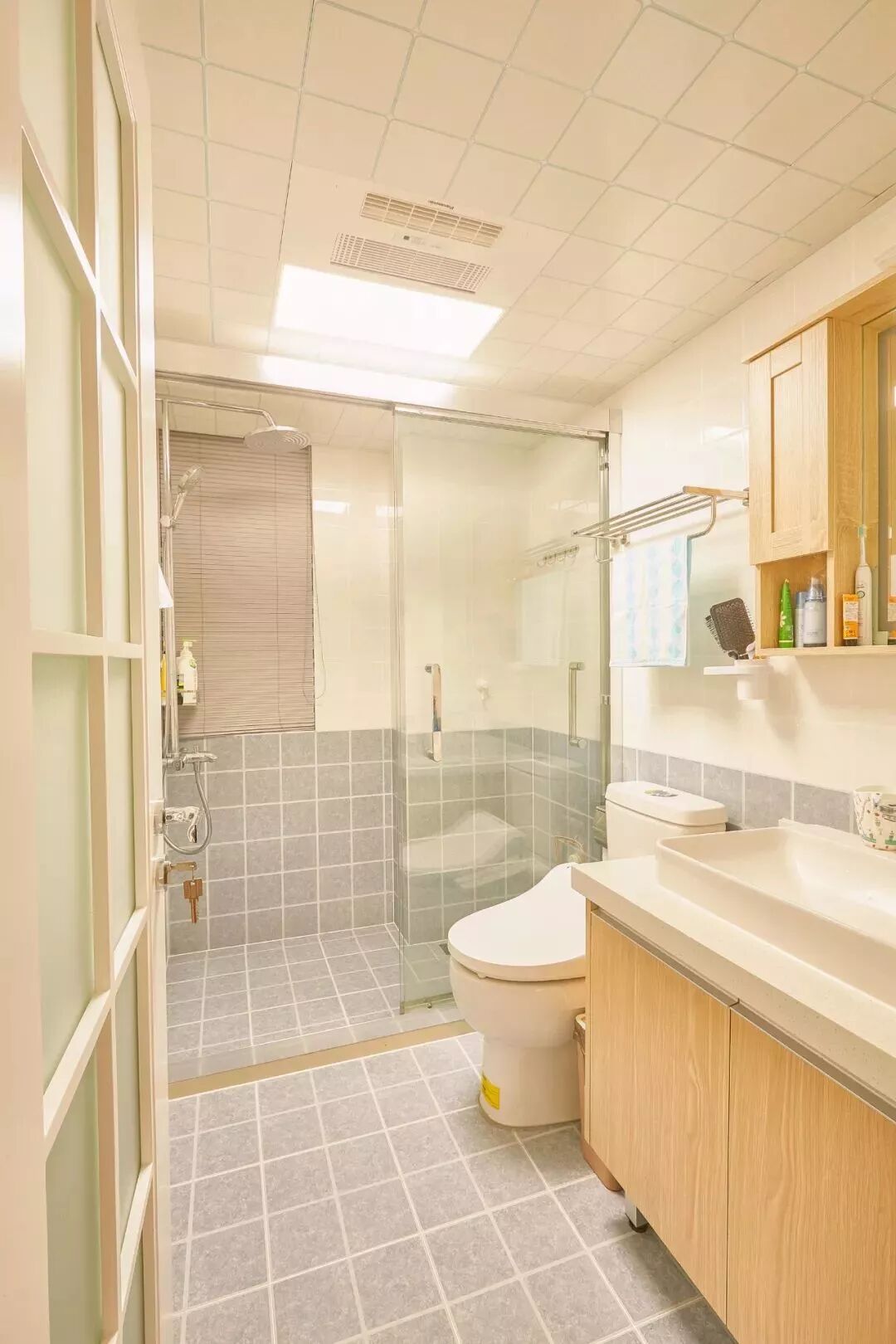而一些比较方正的卫生间,一字排开的淋浴房、马桶、洗手盆是空间不足的,这个时候就可以以三角形的分布,这样在有限的空间内,同样可以保持通畅实用的功能。
