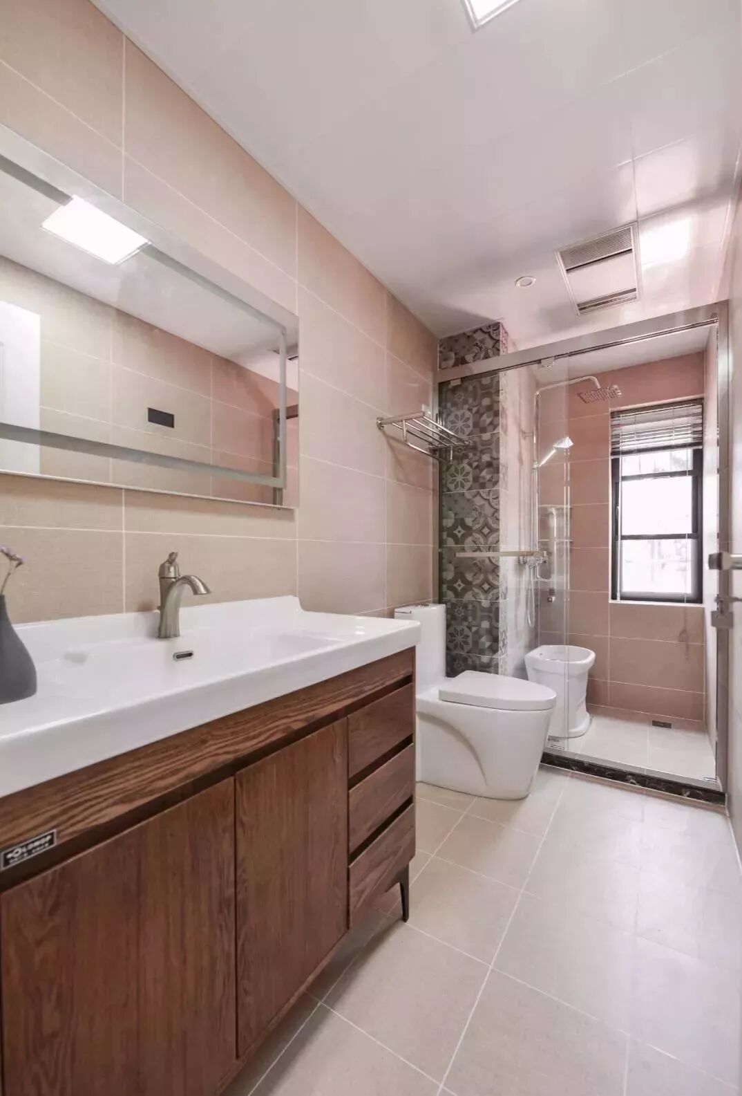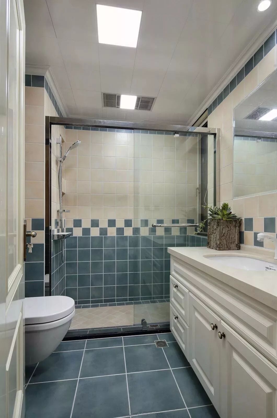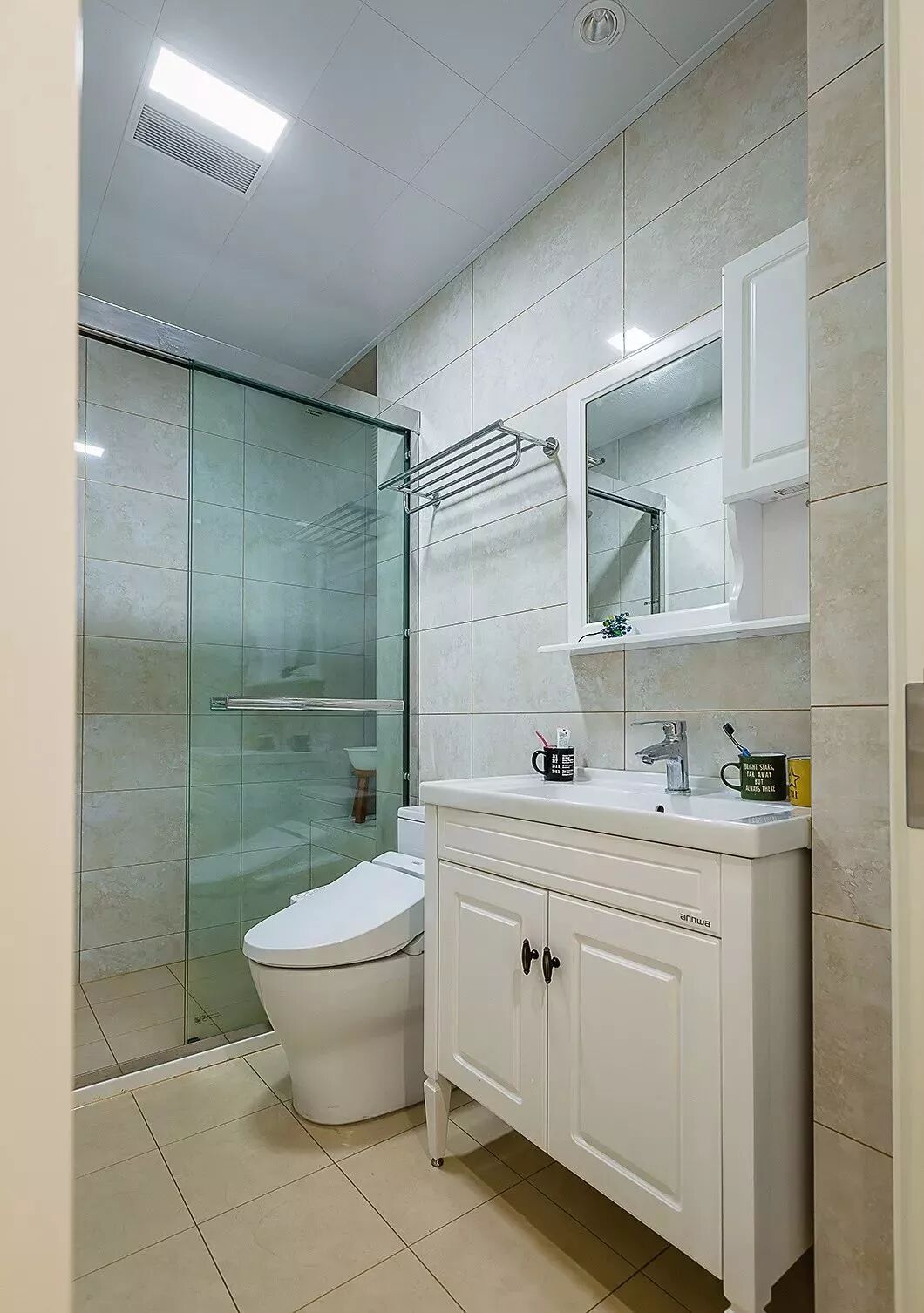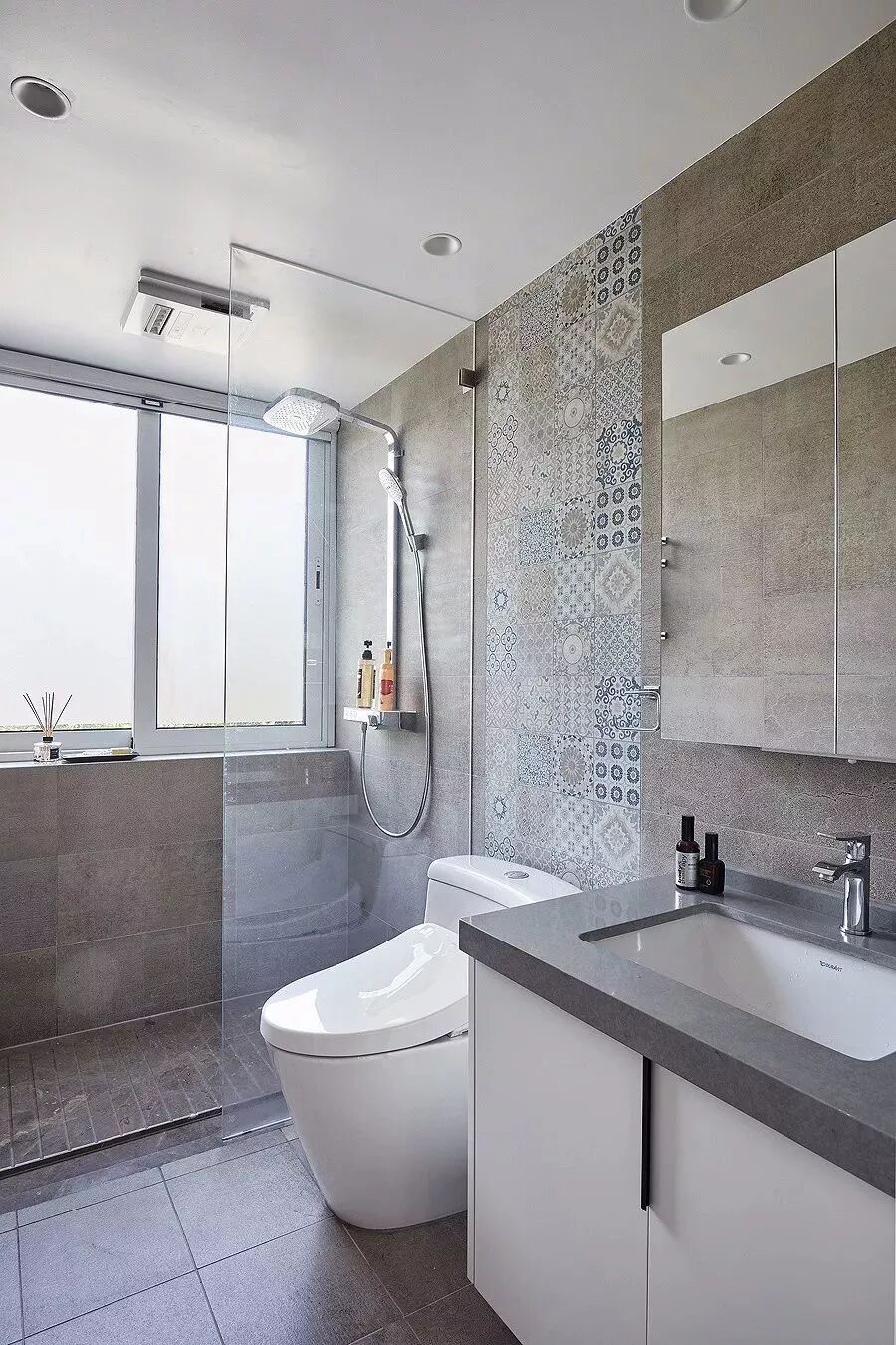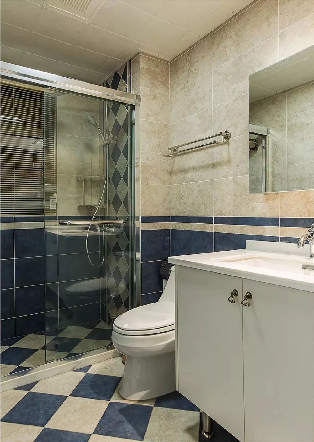 而一些比较方正的卫生间,一字排开的淋浴房、马桶、洗手盆是空间不足的,这个时候就可以以三角形的分布,这样在有限的空间内,同样可以保持通畅实用的功能。