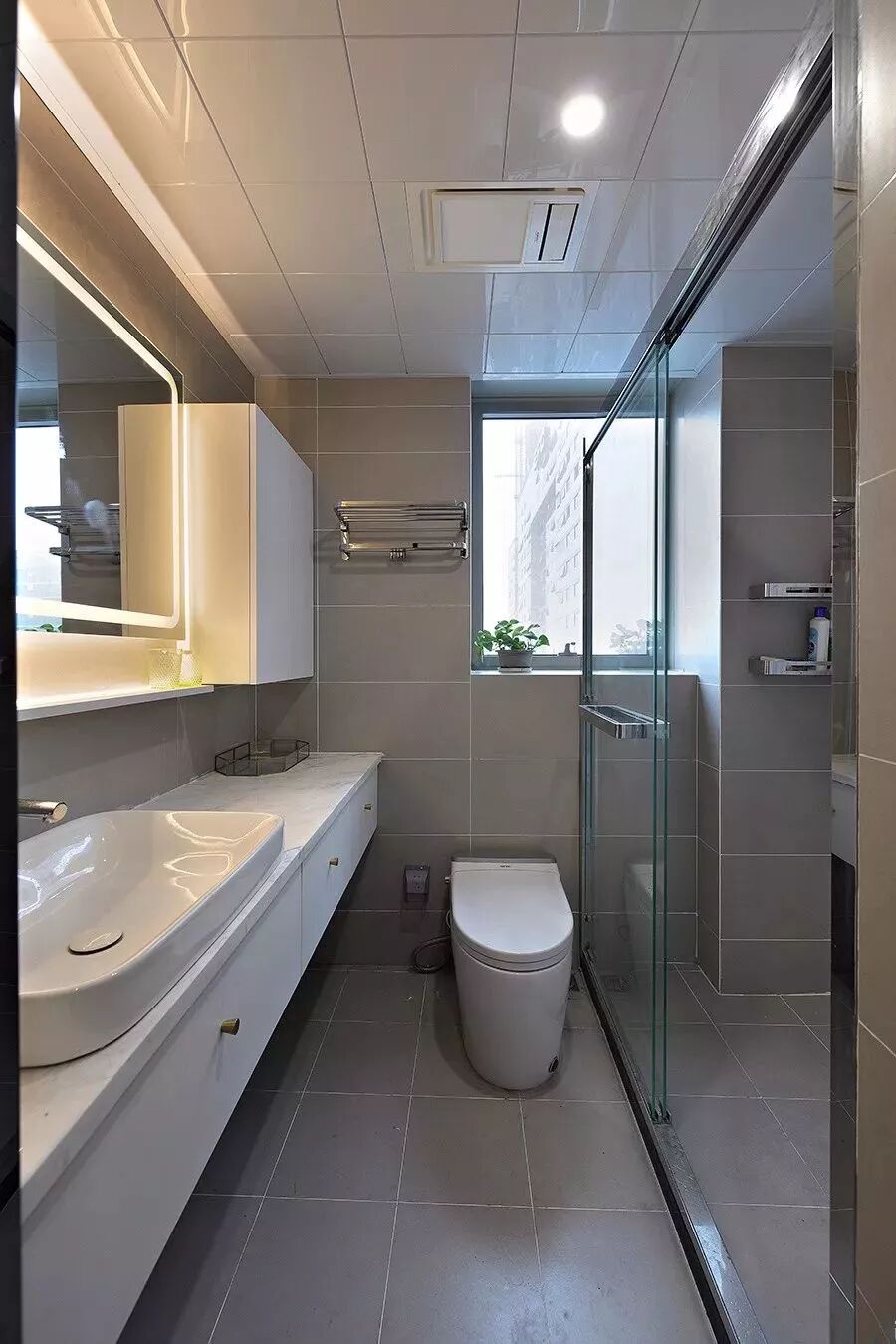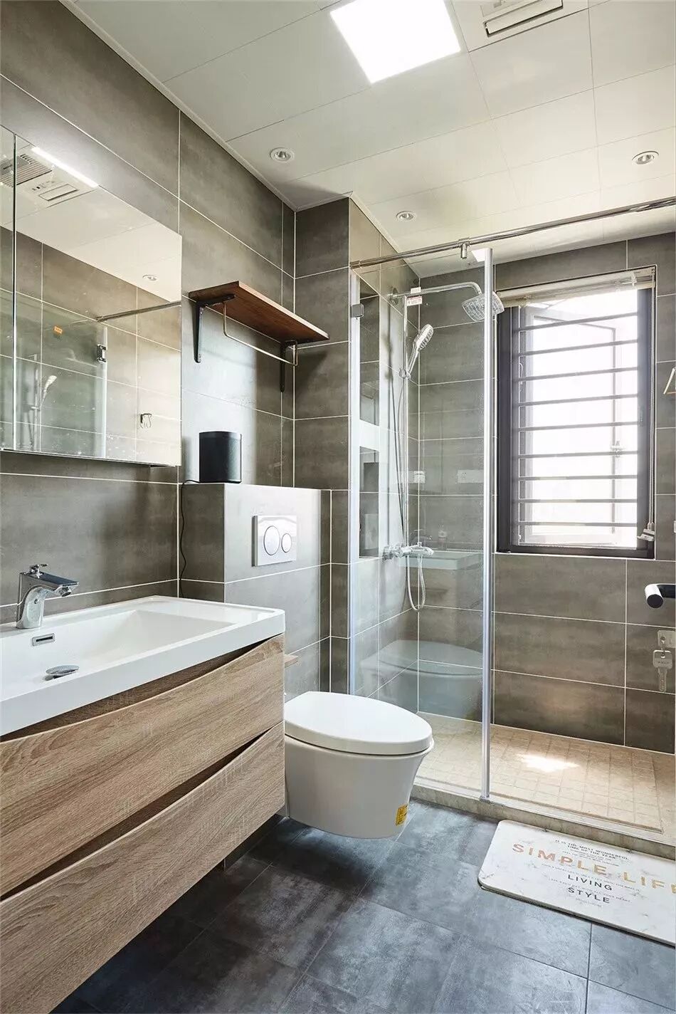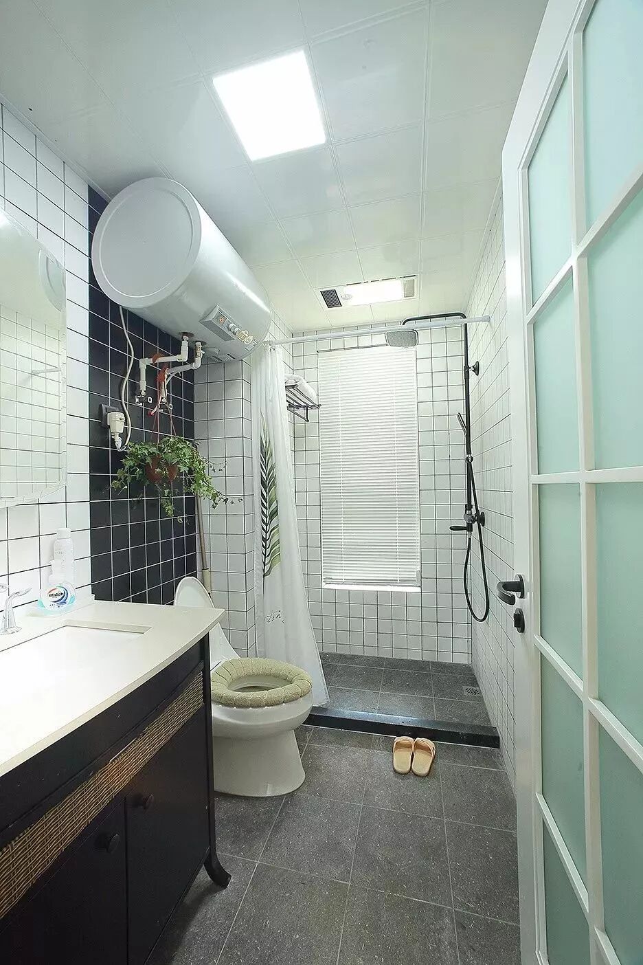 适合那些比较狭长的卫生间,把淋浴房、马桶、洗手盆分布在同一条线上,设计的空间动线不会被堵上,更加舒适宽松。