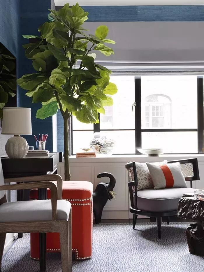 灰蓝色的宁静气质十分适合于打造平静祥和的自然居所。使用灰蓝色壁纸装饰墙面,纹理自然的质感令空间更加精致细腻。搭配高级灰、纯白、重黑及黄昏蓝家居,沉静的色调平铺直叙的表达着随性美学。以一抹悦动的橙与绿装饰出空间的活力与生机,点睛之势令空间更具诱惑力。