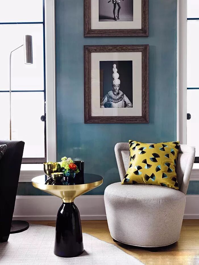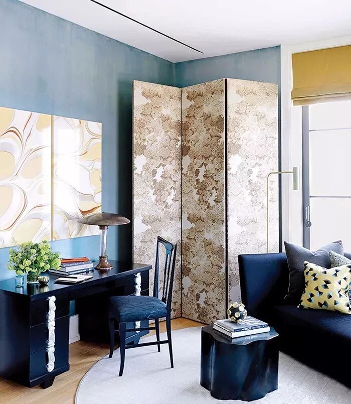 在这套配色中,以低饱和度的灰蓝色为背景,沙发地毯等家居配搭同样属性的灰色系,营造出清雅通透的视感及意境。大胆运用金色作为点缀,耀眼夺目的光泽突出了空间的色彩魅力,强调出奢美体验。简洁的格局陈设,配合着黑白蓝经典色调的晕染,将现代时尚气息铺陈释放。古巴砂色屏风带入了一丝典雅美韵,配合着充满艺术感的精致挂画,整个空间可谓是有颜值有气质。