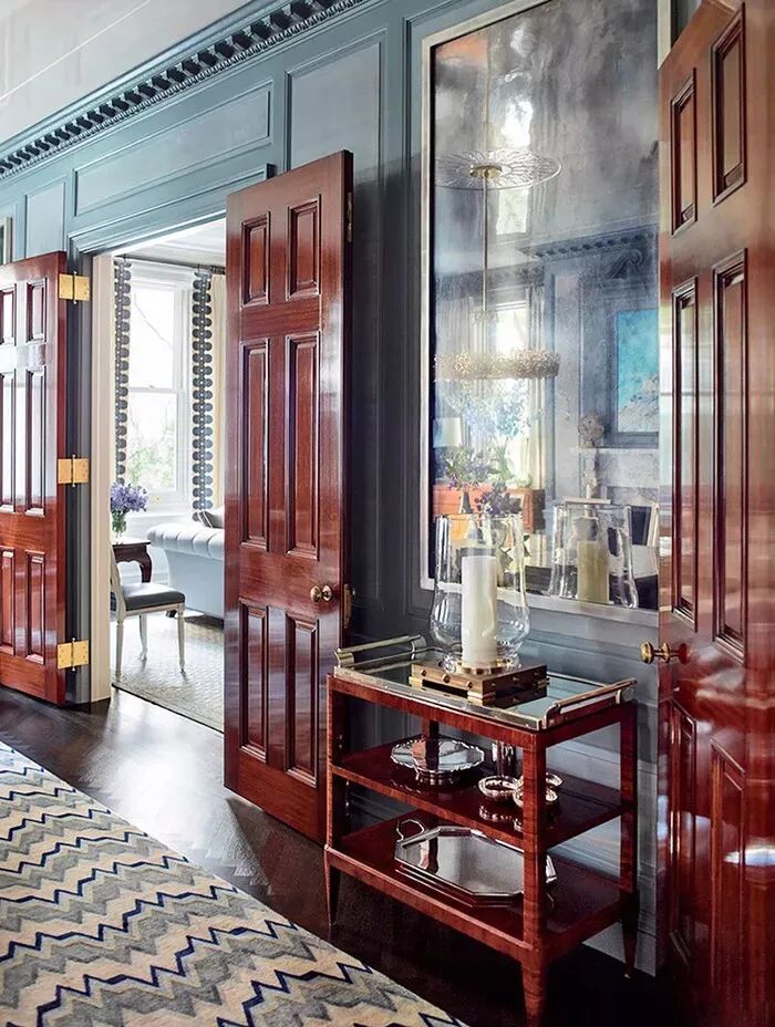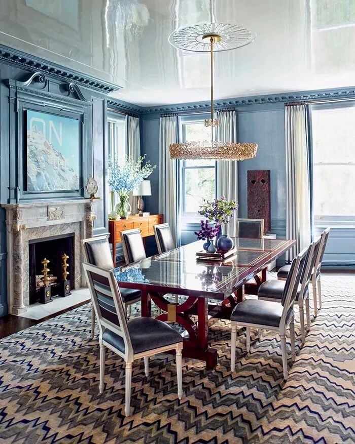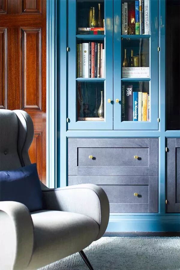 低灰度与饱和度的灰蓝色不像灰那样清冷绝对也不像蓝那样冷艳张扬,细腻温润的色泽有着自己独特的睿智和温柔,给人以更大的想象空间、深思及平和的视觉感受。将灰蓝色用于现代居室的装饰打造,墙面漆结合张力线条的极致勾勒,凸显出优雅率性的现代美学。配搭高级灰布艺家居及红棕色原木装饰,鲜明的色彩碰撞传递出一种极为沉静、奢雅的时尚美感。
