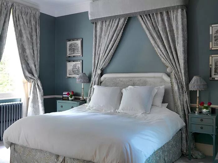 田园风标配元素的碎花布艺体现着浪漫精致、优雅自然的气质格调,与视感柔和的高级灰色调结合,用于床幔、窗帘、床裙等卧室居室内重要的布艺装饰上,与质感相似的温柔灰蓝色墙面背景形成视线联结,柔雅沉静的色觉晕染,加之浪漫气度的升华加持,整个空间酝酿出清隽诗意的唯美意境。