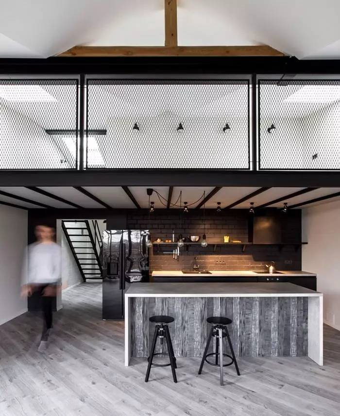 二楼网状结构隔断和黑色铁件的运用为整个空间营造了冷硬的气氛。但用暖色的木地板,加上绿植点缀,使空间更具都市现代感。