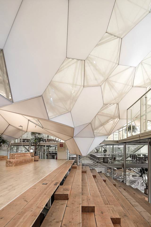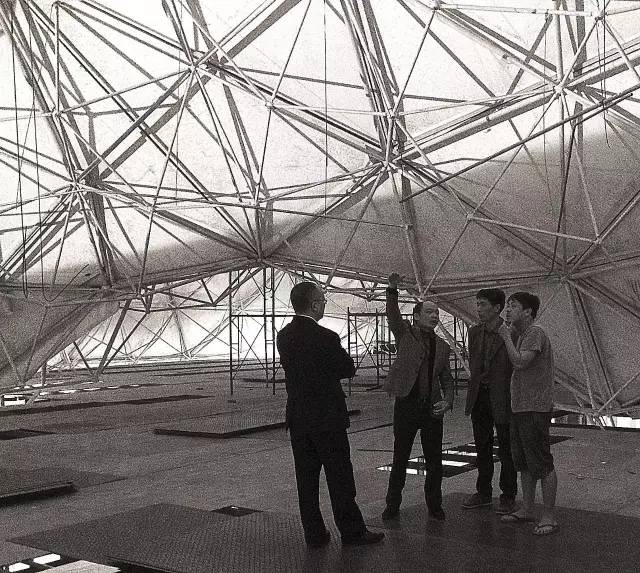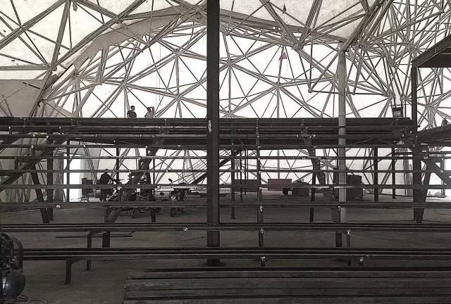 另外,原有的建筑是单层膜结构,整个室内的能源损耗会很大,为了节省能源,同时,又能将现场球形网架的气势和裸露结构的美感保留下来,我们跟材料公司协商后,在室内加多了一层透明膜。