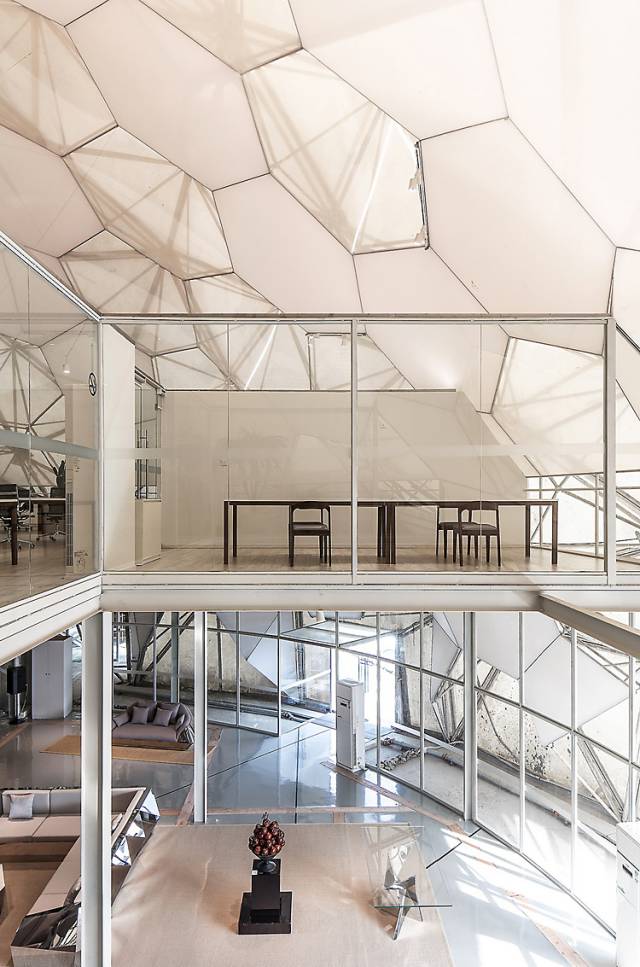 所以,保留并将原有球形网架的钢结构暴露出来,延伸原有钢结构的穿插痕迹同,就成了我们整体设计的基本方向和手法要求。