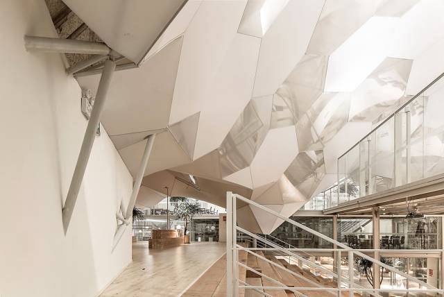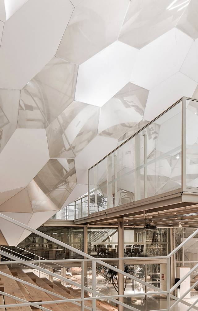 为了打破常规办公楼局促感和紧张的气氛,室内还种植了很多植物,设置了多重楼梯,人在空间里可以自由走动。