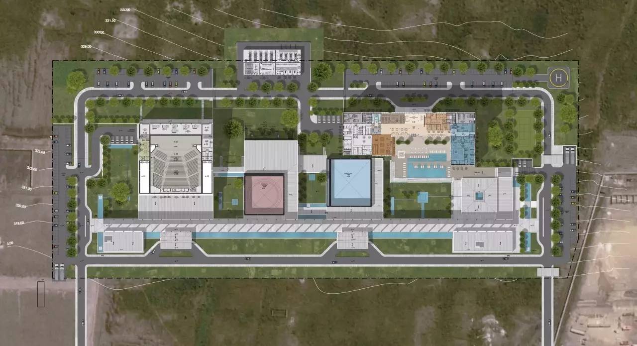 在场地内,建筑物的朝向很大程度上是由地形决定的。我们尽量减少过度开挖和迁移土层而对地形造成的影响。这个项目的设计主体是能够容纳1500人的国会大厅, 300人的总统大厅, 1000人的宴会厅和1000人的公共广场。公共广场被设计成线性,与庭院相结合,都连接着带顶连廊。