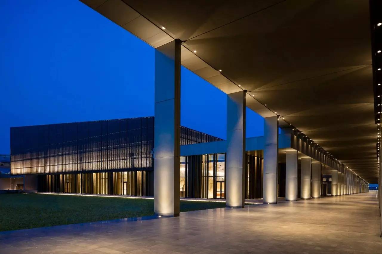 夜晚,长廊柱子被地埋灯洗亮, 棚顶的筒灯照亮着地面,整个区域灯火通明。多于6个月的全年雨是刚果一直存在的气候现象。因此,重要的设计方向是当人们在室外空间时,庇护人们免受雨水的影响,但是不是远离自然。庇护空间不仅对避雨有要求,空气流通这方面的考虑也是必不可少的。